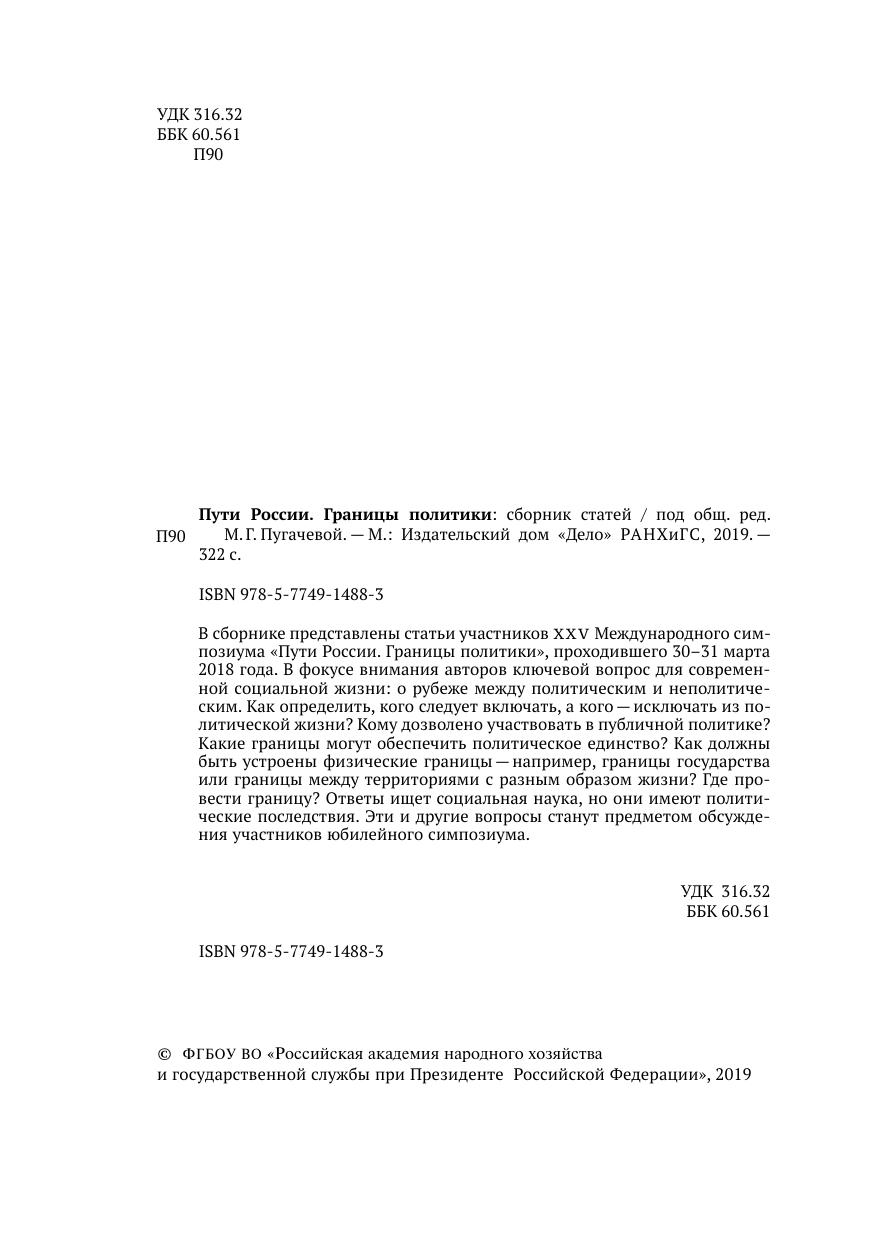 В сборнике представлены статьи участников XXV Международного симпозиума «Пути России. Границы политики», проходившего 30–31 марта 2018 года. В фокусе внимания авторов ключевой вопрос для современной социальной жизни: о рубеже между политическим и неполитическим. Как определить, кого следует включать, а кого — исключать из политической жизни? Кому дозволено участвовать в публичной политике? Какие границы могут обеспечить политическое единство? Как должны быть устроены физические границы — например, границы государства или границы между территориями с разным образом жизни? Где провести границу? Ответы ищет социальная наука, но они имеют политические последствия. Эти и другие вопросы станут предметом обсуждения участников юбилейного симпозиума.