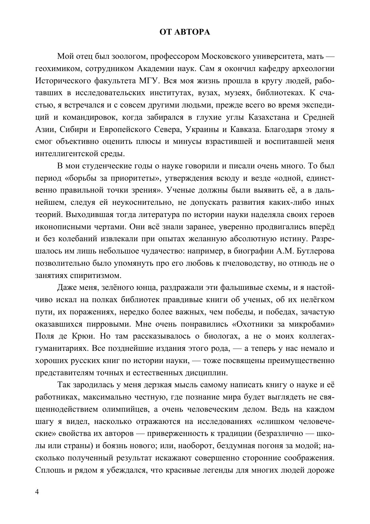 Книга принадлежит перу археолога и историка Александра Александровича Формозова. Его по праву считают выдающимся исследователем культуры и искусства первобытной эпохи на территории нашей страны, а вместе с тем – основоположником историографии российских древностей. В настоящей работе им отобрана и блестяще проанализирована серия немаловажных моментов в истории гуманитарной науки, прежде всего археологии, в России второй половины XIX – начала XXI веков. Воссоздавая выразительные портреты многих русских ученых, панораму общественной обстановки их жизни и деятельности, автор на этой фактической основе делится с читателями своими выводами и раздумьями относительно морально-этических основ научного познания.