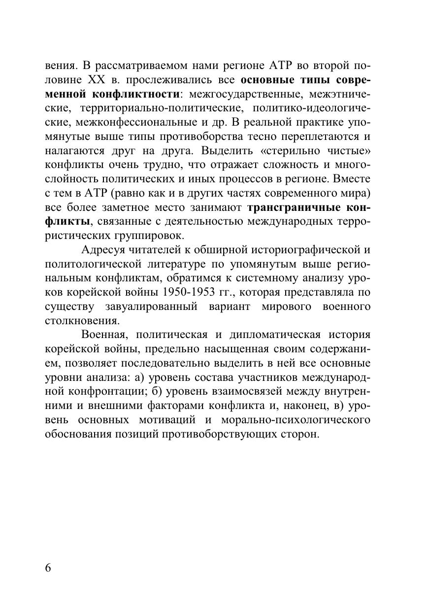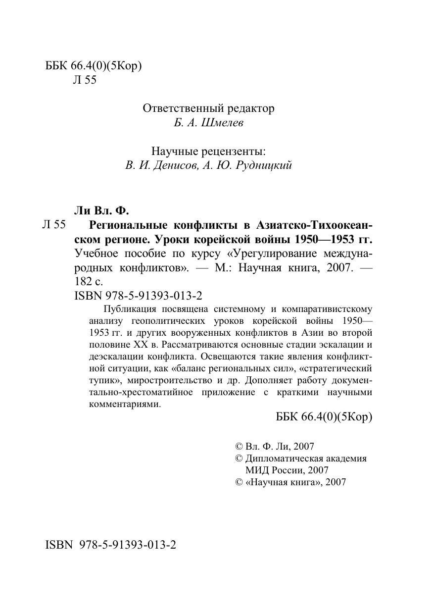 Публикация посвящена системному и компаративистскому анализу геополитических уроков корейской войны 1950— 1953 гг. и других вооруженных конфликтов в Азии во второй половине XX в. Рассматриваются основные стадии эскалации и деэскалации конфликта. Освещаются такие явления конфликтной ситуации, как «баланс региональных сил», «стратегический тупик», миростроительство и др. Дополняет работу документально-хрестоматийное приложение с краткими научными комментариями.