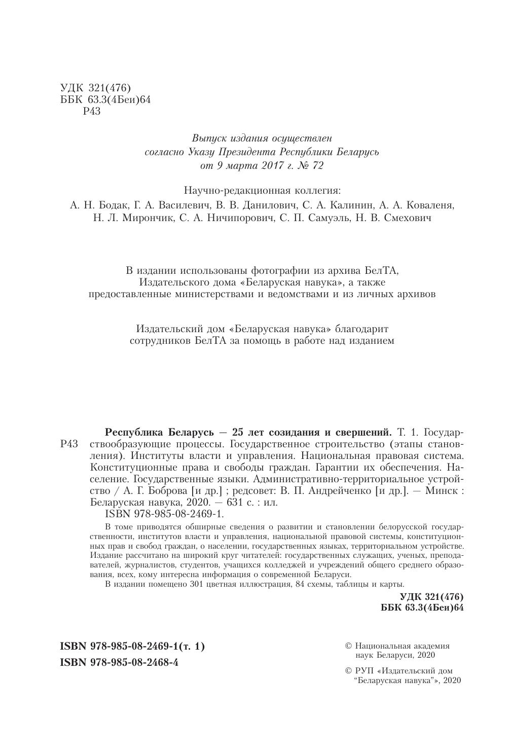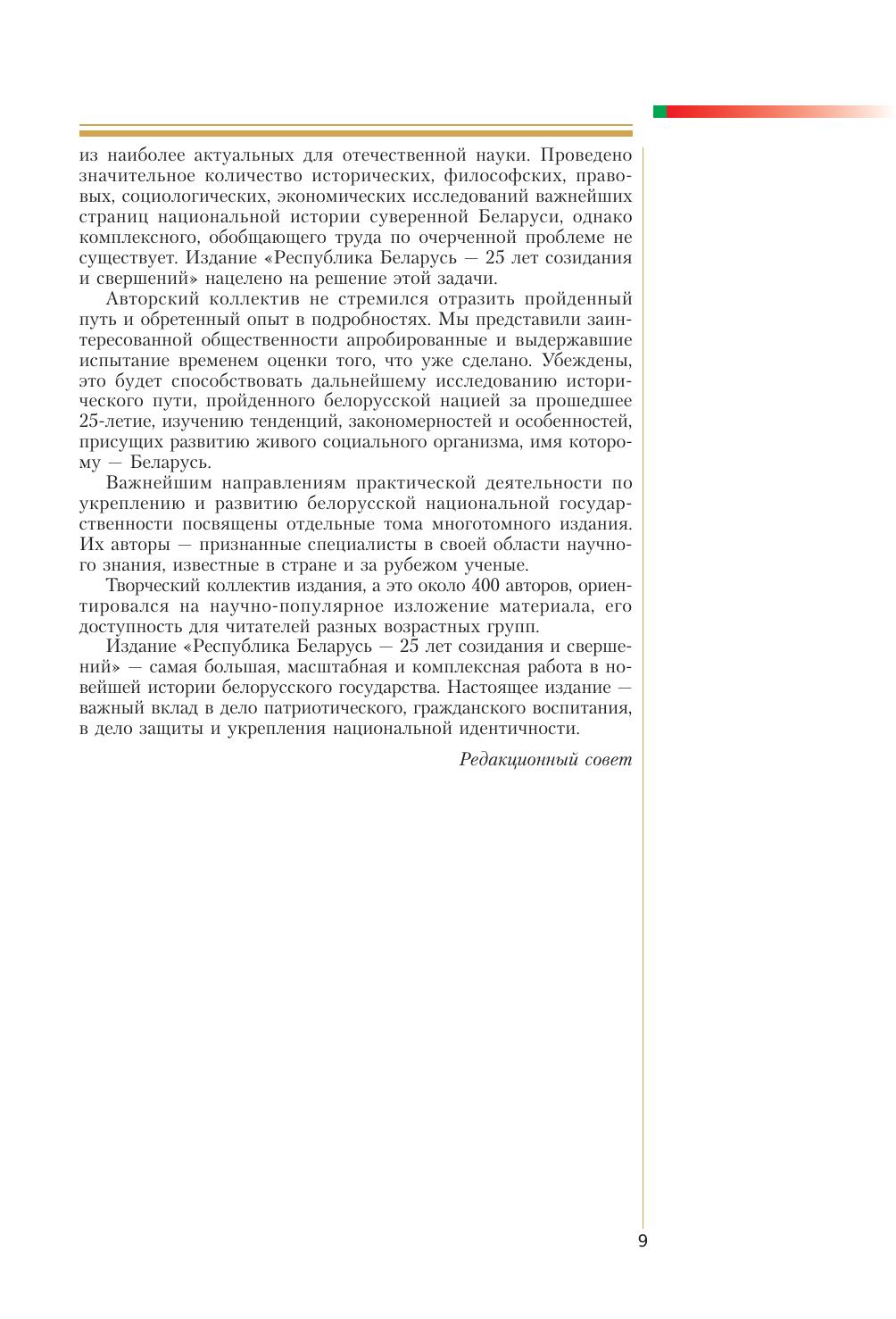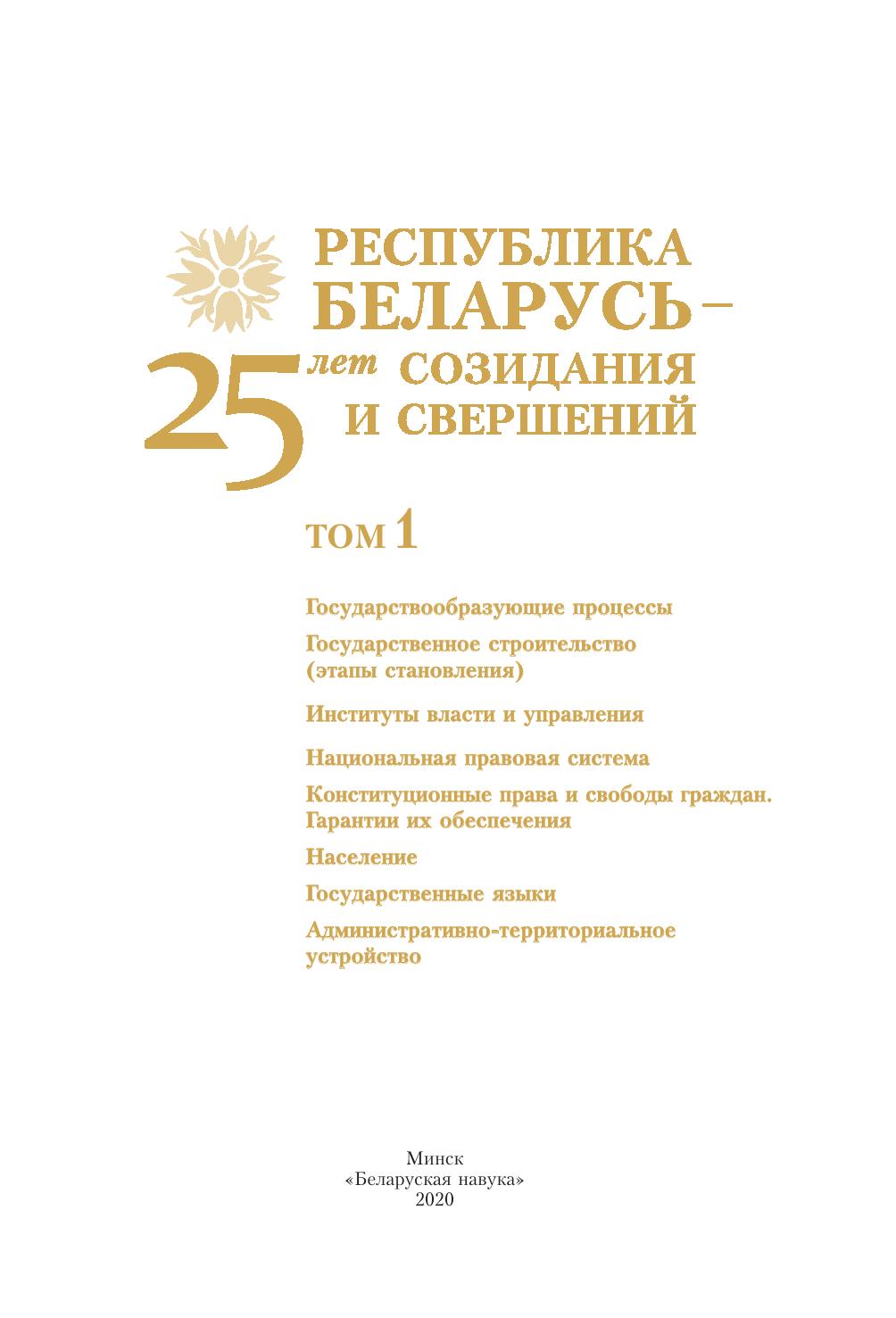 Республика Беларусь — 25 лет созидания и свершений. Т. 1. Государствообразующие процессы. Государственное строительство (этапы становления). Институты власти и управления. Национальная правовая система. Конституционные права и свободы граждан. Гарантии их обеспечения. Население. Государственные языки. Административно-территориальное устройство