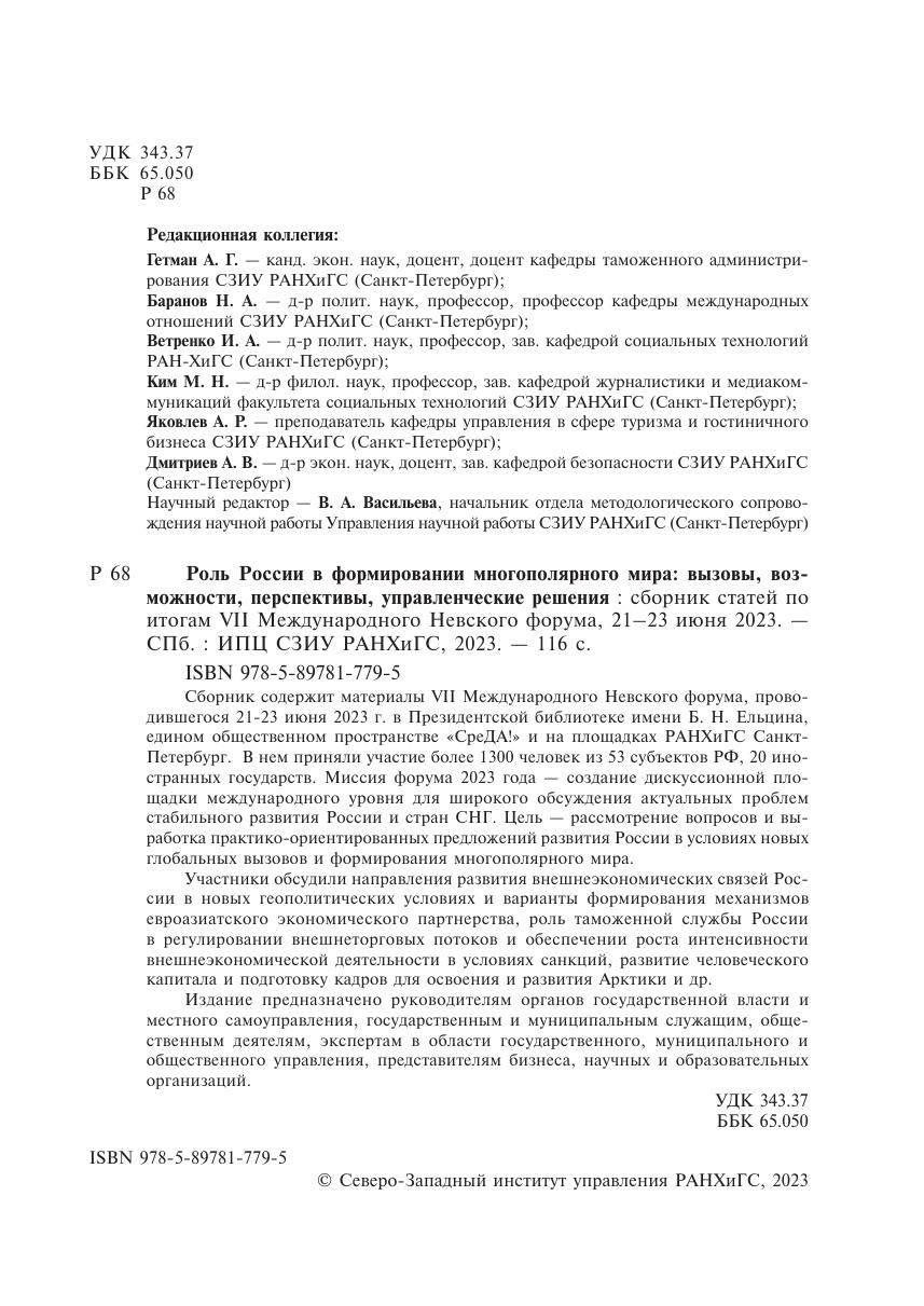 Роль России в формировании многополярного мира: вызовы, возможности, перспективы, управленческие решения : сборник статей по итогам VII Международного Невского форума, 21–23 июня 2023.