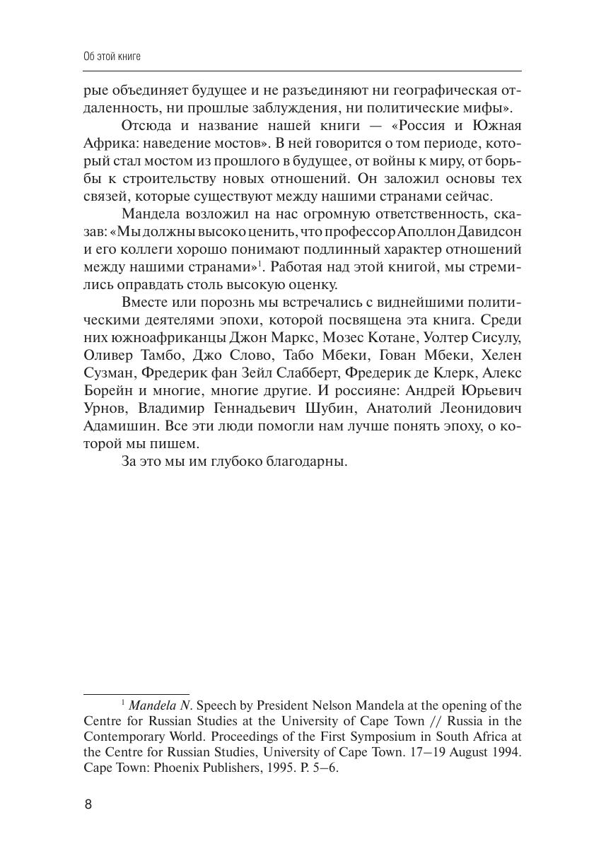 Как складывались отношения между нашей страной и далекой Южно-Африканской Республикой во второй половине XX века? Почему именно деятельность Советского Союза стала одним из самых важных политических факторов на юге Африканского континента? Какую роль сыграла Россия в переменах, произошедших в ЮАР в конце прошлого века? Каковы взаимные образы и представления, сложившиеся у народов наших двух стран друг о друге? Об этих вопросах и идет речь в книге. Она обращена к читателям, которых интересует история Африки и история отношений России с этим континентом, история национально-освободительных движений и внешней политики России и проблемы формирования взаимопонимания между различными народами и странами.