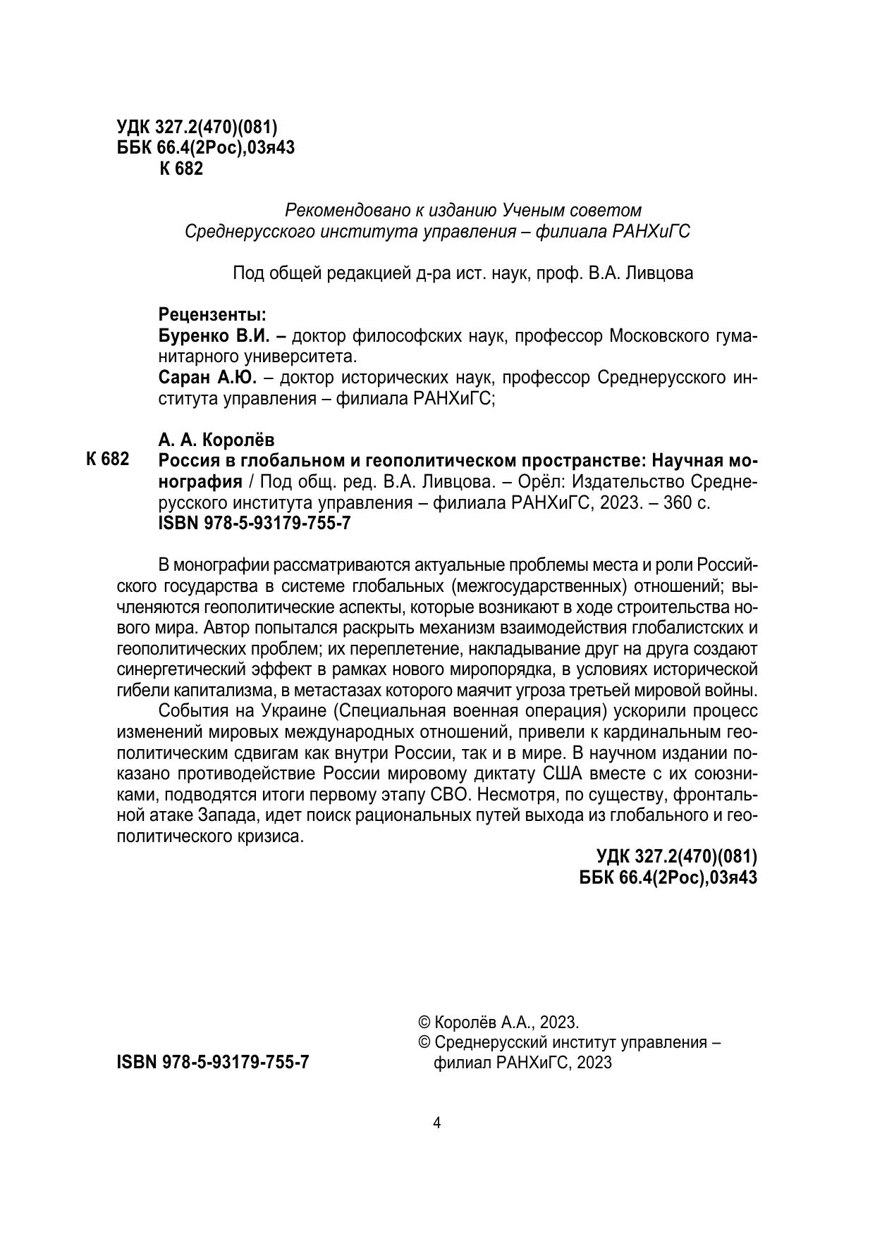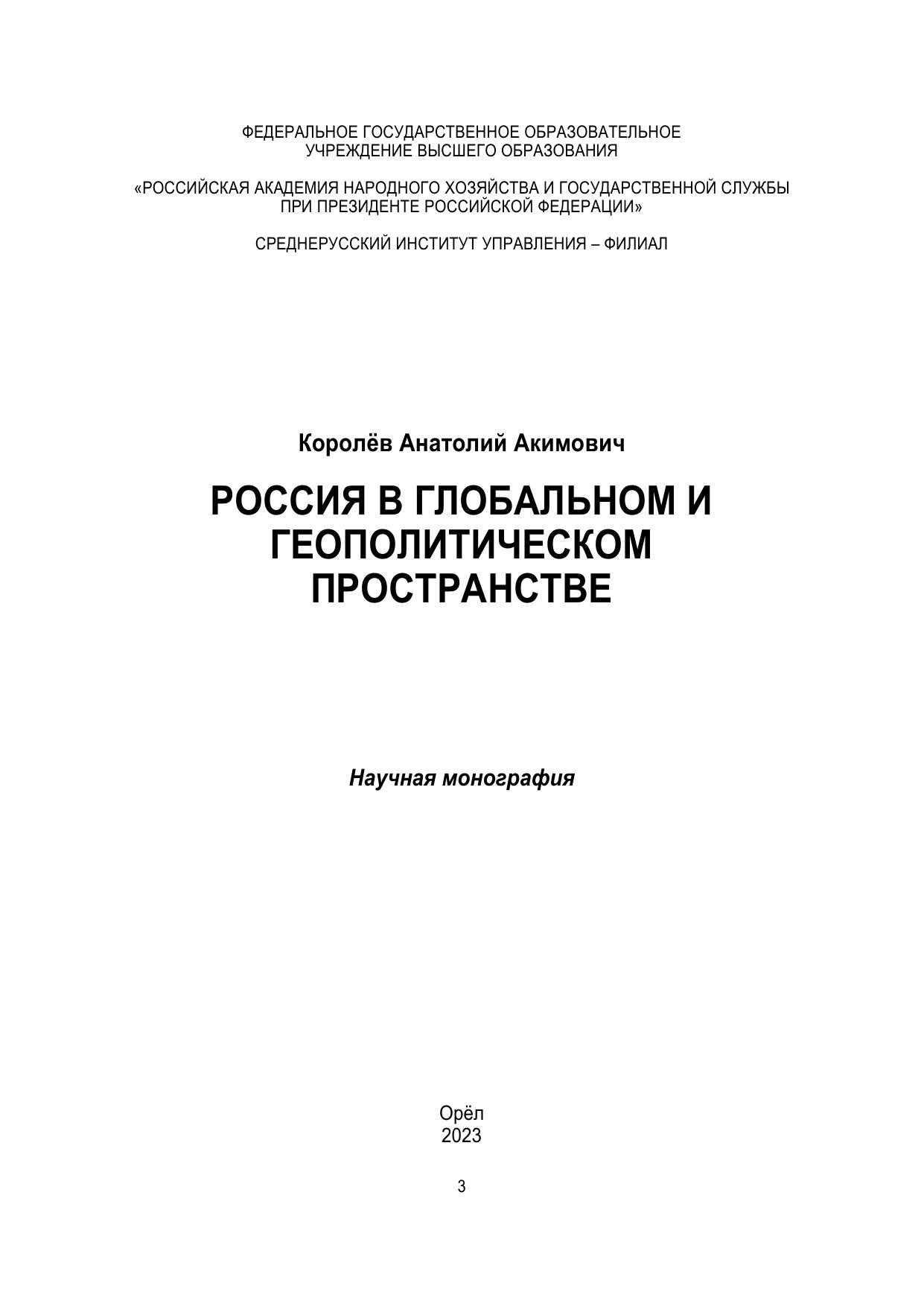 В монографии рассматриваются актуальные проблемы места и роли Российского государства в системе глобальных (межгосударственных) отношений; вычленяются геополитические аспекты, которые возникают в ходе строительства нового мира. Автор попытался раскрыть механизм взаимодействия глобалистских и геополитических проблем; их переплетение, накладывание друг на друга создают синергетический эффект в рамках нового миропорядка, в условиях исторической гибели капитализма, в метастазах которого маячит угроза третьей мировой войны. События на Украине (Специальная военная операция) ускорили процесс изменений мировых международных отношений, привели к кардинальным геополитическим сдвигам как внутри России, так и в мире. В научном издании показано противодействие России мировому диктату США вместе с их союзниками, подводятся итоги первому этапу СВО. Несмотря, по существу, фронтальной атаке Запада, идет поиск рациональных путей выхода из глобального и геополитического кризиса.