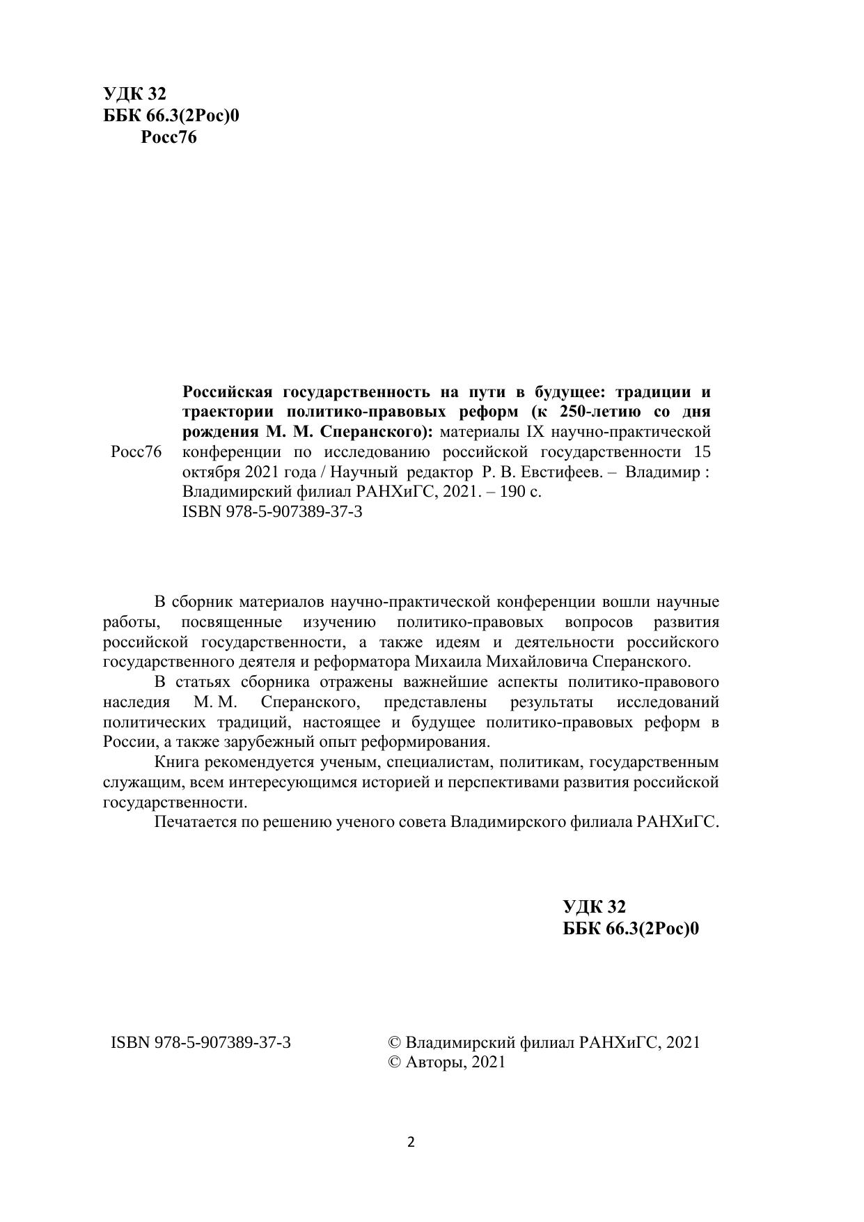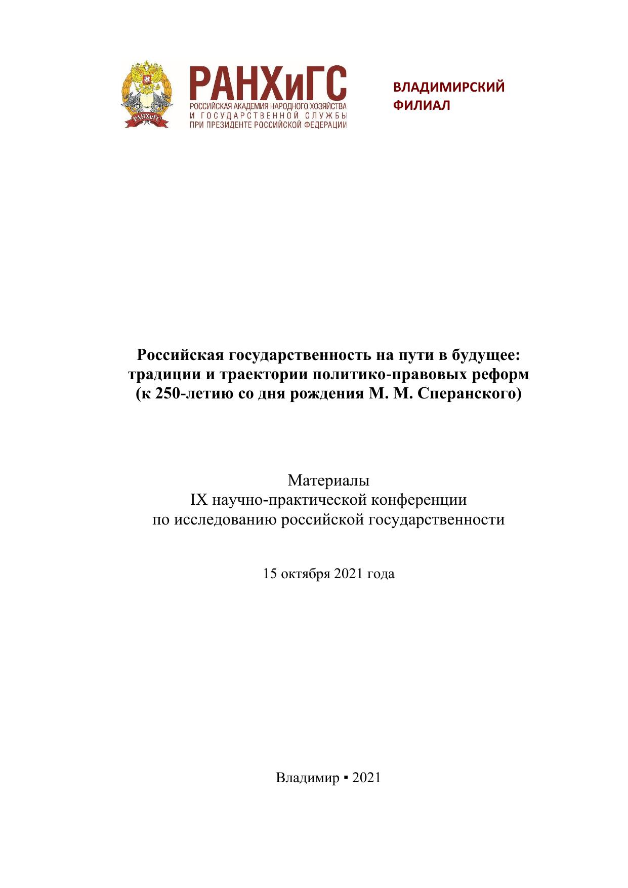 Российская государственность на пути в будущее: традиции и траектории политико-правовых реформ (к 250-летию со дня рождения М. М. Сперанского): материалы IX научно-практической конференции по исследованию российской государственности 15 октября 2021 года