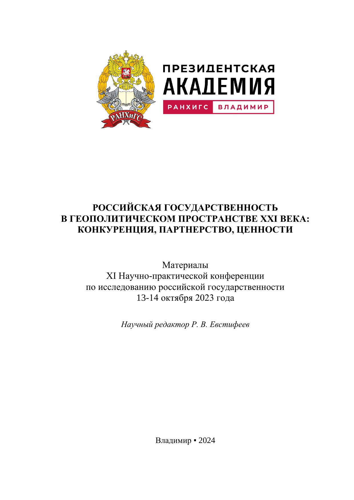 Российская государственность в геополитическом пространстве XXI века: конкуренция, партнерство, ценности: материалы XI Научно-практической конференции по исследованию российской государственности 13-14 октября 2023 года