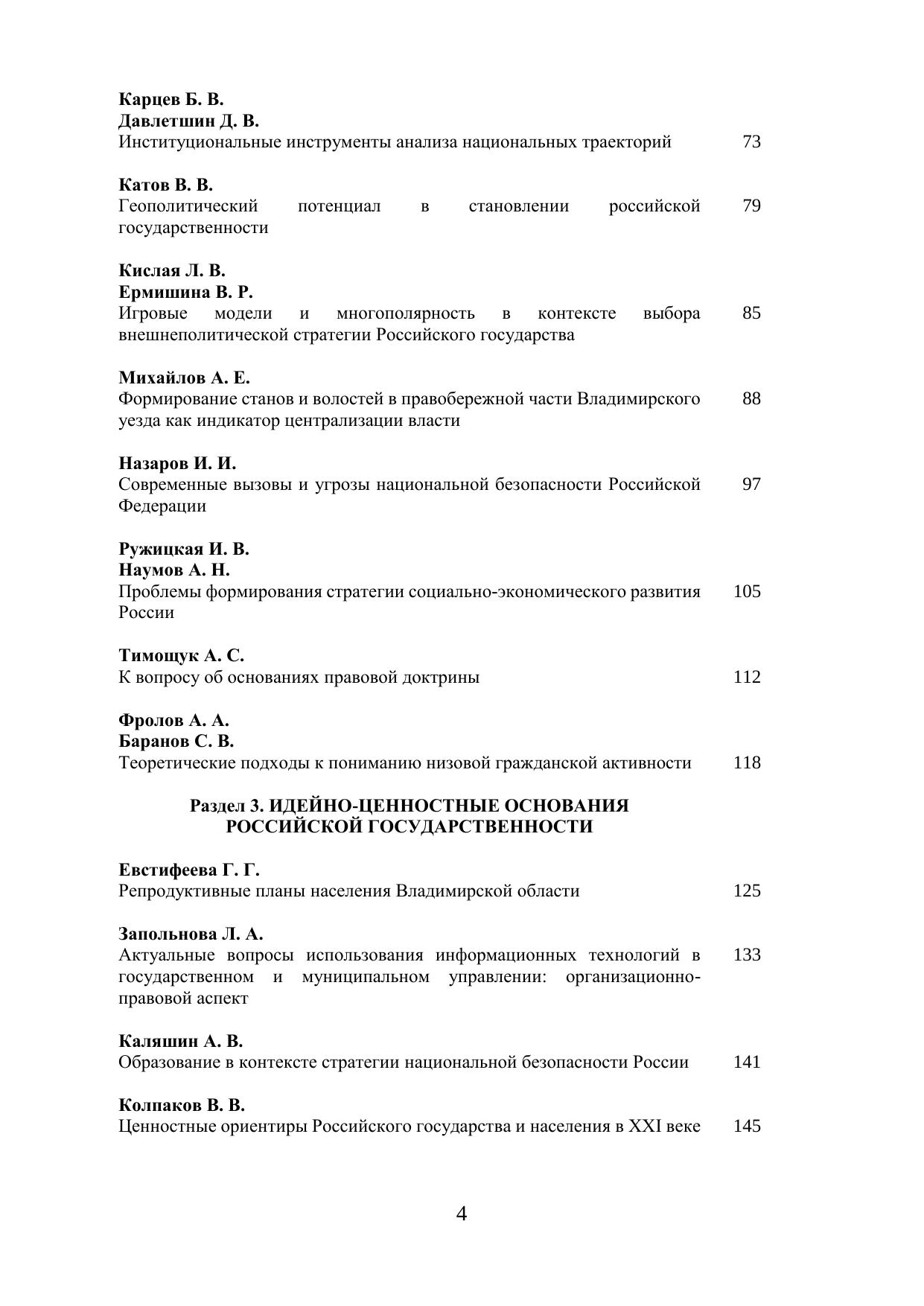 В сборник материалов научно-практической конференции вошли научные работы, посвященные траекториям развития российской государственности в XXI веке. В статьях авторов сборника раскрываются геополитические обоснования роли и места России в мире, а также перспектив ее развития. Особое внимание уделяется рассмотрению геополитических вызов XX-XXI веков и проблем национальной безопасности. Значительная часть статей посвящена выявлению и анализу конкурентных преимуществ российской государственности в условиях неопределенности, а также идейно-ценностным основаниям российской государственности, включая проблемы внедрения инновационных технологий и методик при подготовке управленческих кадров. Книга рекомендуется ученым, специалистам, политикам, государственным служащим, всем интересующимся историей и перспективами развития российской государственности. Печатается по решению ученого совета Владимирского филиала РАНХиГС.