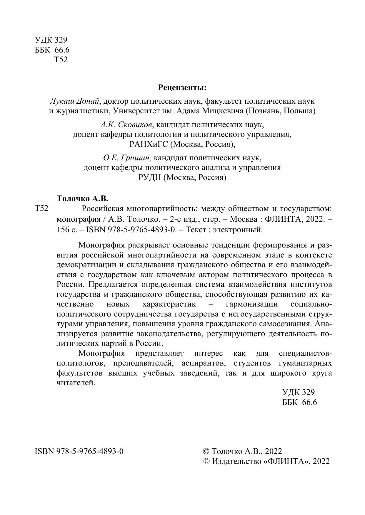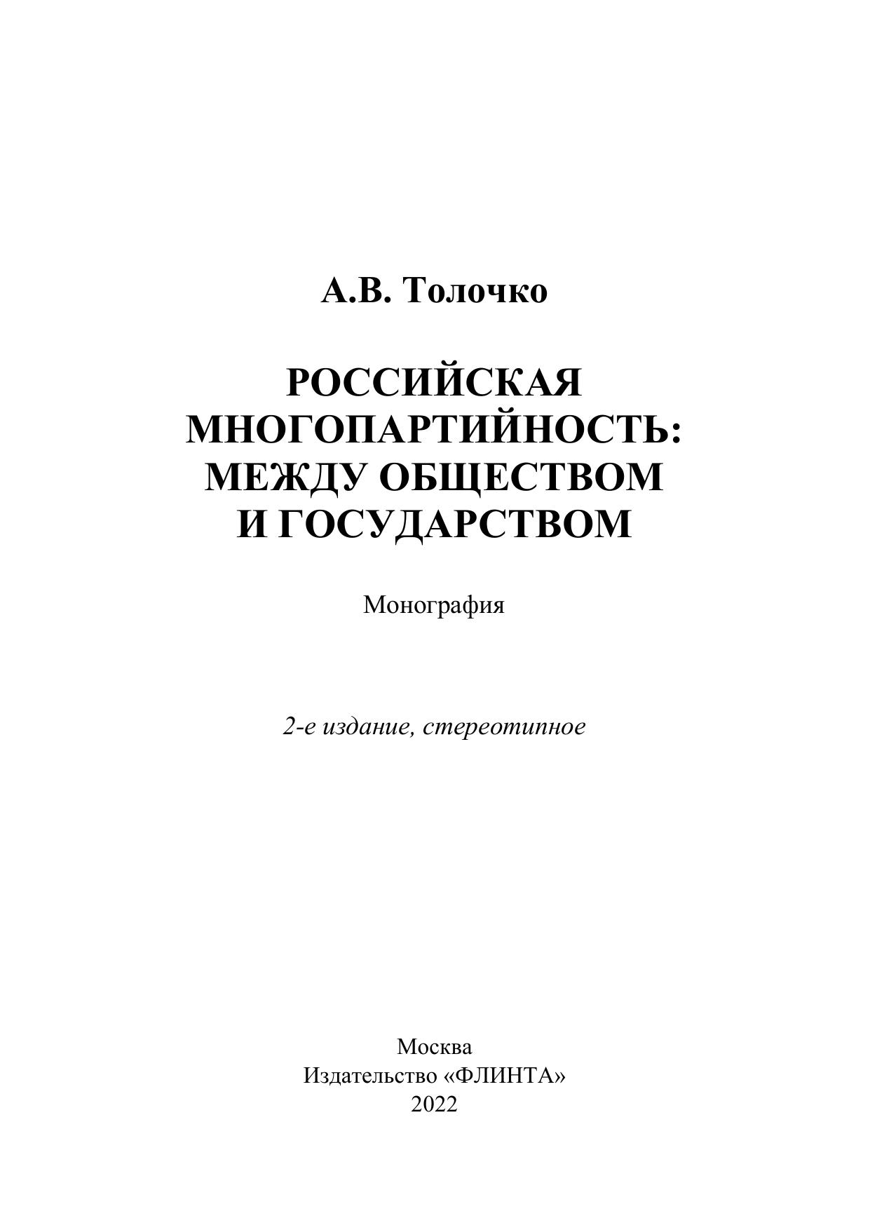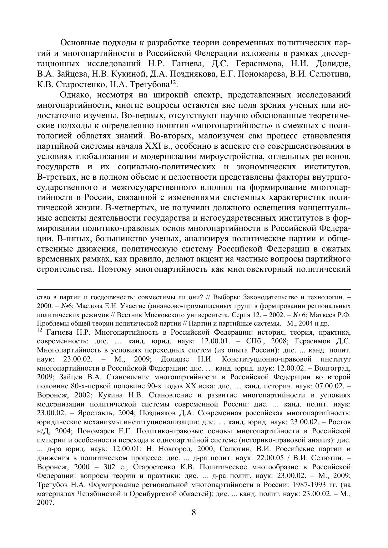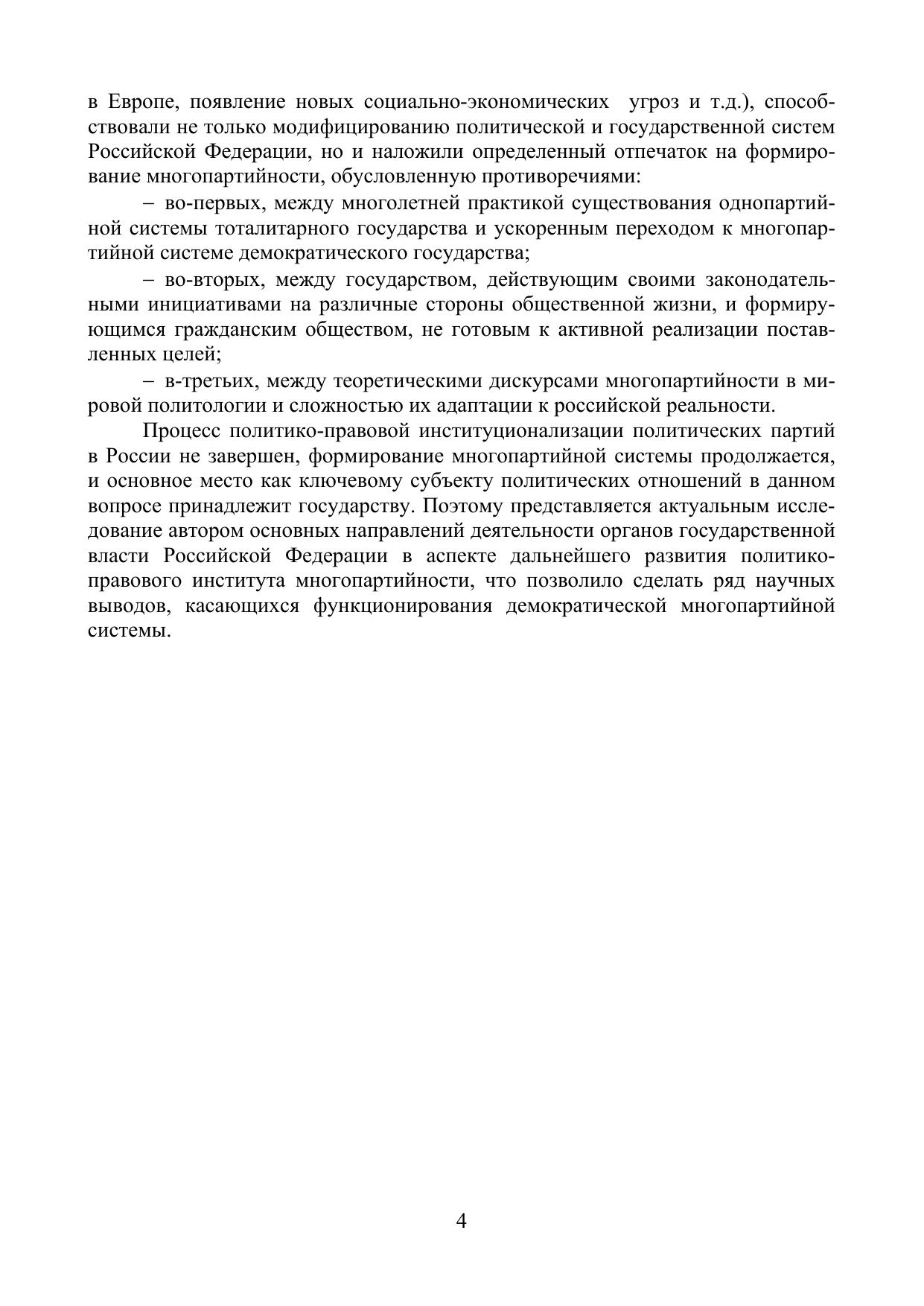 Монография раскрывает основные тенденции формирования и развития российской многопартийности на современном этапе в контексте демократизации и складывания гражданского общества и его взаимодействия с государством как ключевым актором политического процесса в России. Предлагается определенная система взаимодействия институтов государства и гражданского общества, способствующая развитию их качественно новых характеристик – гармонизации социально-политического сотрудничества государства с негосударственными структурами управления, повышения уровня гражданского самосознания. Анализируется развитие законодательства, регулирующего деятельность политических партий в России.