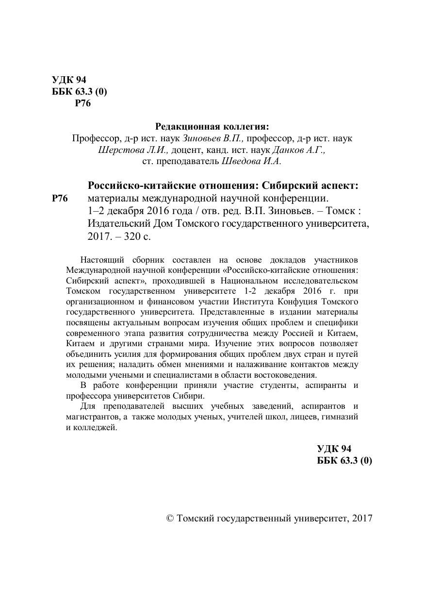 Настоящий сборник составлен на основе докладов участников Международной научной конференции «Российско-китайские отношения: Сибирский аспект», проходившей в Национальном исследовательском Томском государственном университете 1-2 декабря 2016 г. при организационном и финансовом участии Института Конфуция Томского государственного университета. Представленные в издании материалы посвящены актуальным вопросам изучения общих проблем и специфики современного этапа развития сотрудничества между Россией и Китаем, Китаем и другими странами мира. Изучение этих вопросов позволяет объединить усилия для формирования общих проблем двух стран и путей их решения, наладить обмен мнениями и налаживание контактов между молодыми учеными и специалистами в области востоковедения. В работе конференции приняли участие студенты, аспиранты и профессора университетов Сибири. Для преподавателей высших учебных заведений, аспирантов и магистрантов, а также молодых ученых, учителей школ, лицеев, гимназий и колледжей.