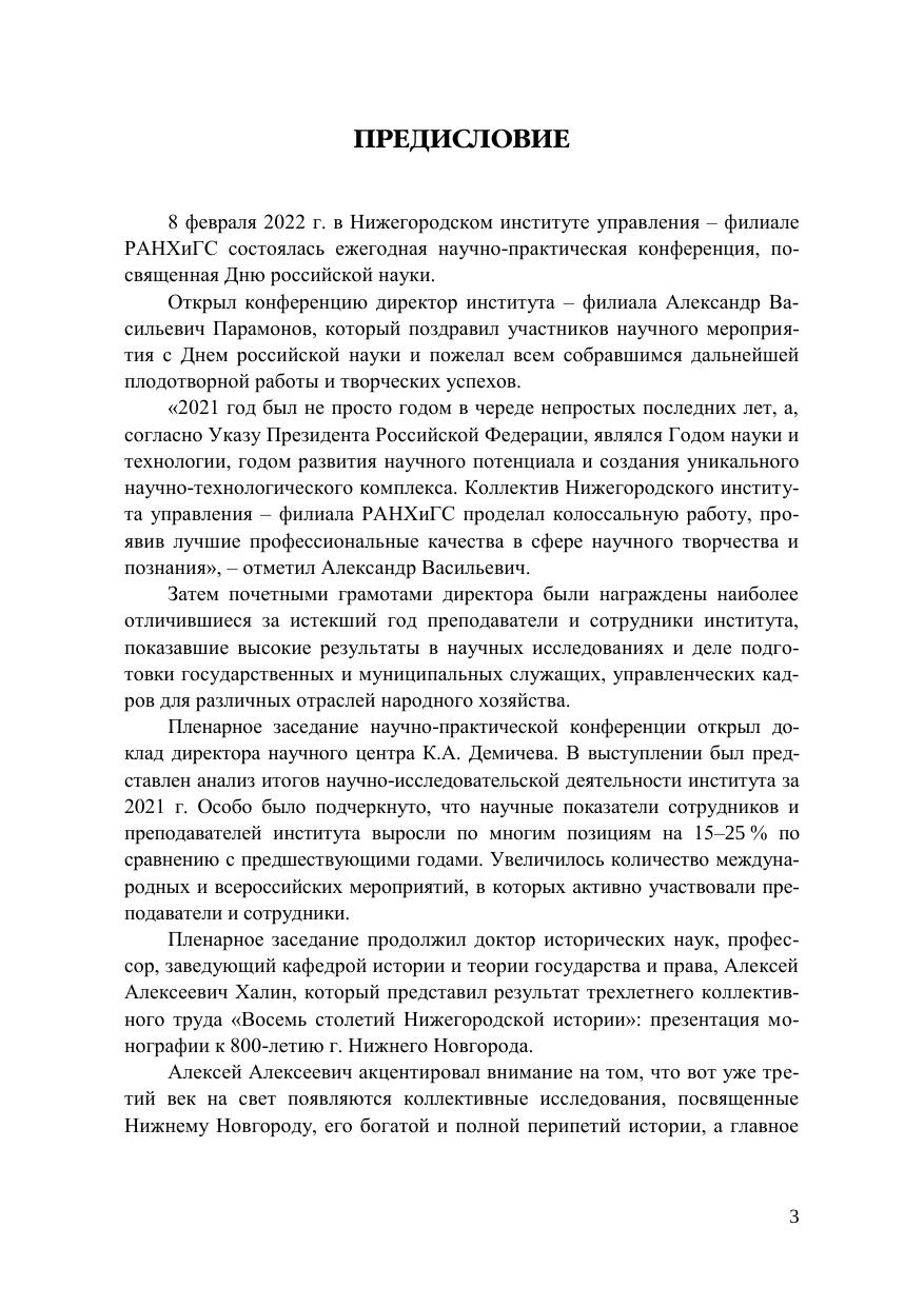 В сборнике научных трудов представлены статьи, подготовленные по результатам Научно-практической конференции, посвященной Дню российской науки, состоявшейся в Нижегородском институте управления – филиале РАНХиГС 8 февраля 2022 года. Книга адресована научным работникам, преподавателям, аспирантам и студентам высших учебных заведений, государственным служащим и специалистам различных отраслей народного хозяйства, а также читателям, интересующимся соответствующей проблематикой.