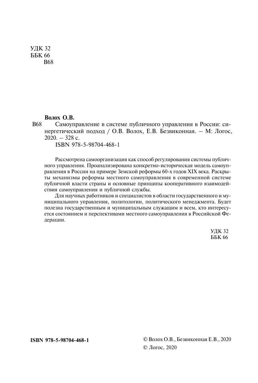 Рассмотрена самоорганизация как способ регулирования системы публичного управления. Проанализирована конкретно-историческая модель самоуправления в России на примере Земской реформы 60-х годов XIX века. Раскрыты механизмы реформы местного самоуправления в современной системе публичной власти страны и основные принципы кооперативного взаимодействия самоуправления и публичной службы. Для научных работников и специалистов в области государственного и муниципального управления, политологии, политического менеджмента. Будет полезна государственным и муниципальным служащим и всем, кто интересуется состоянием и перспективами местного самоуправления в Российской Федерации.