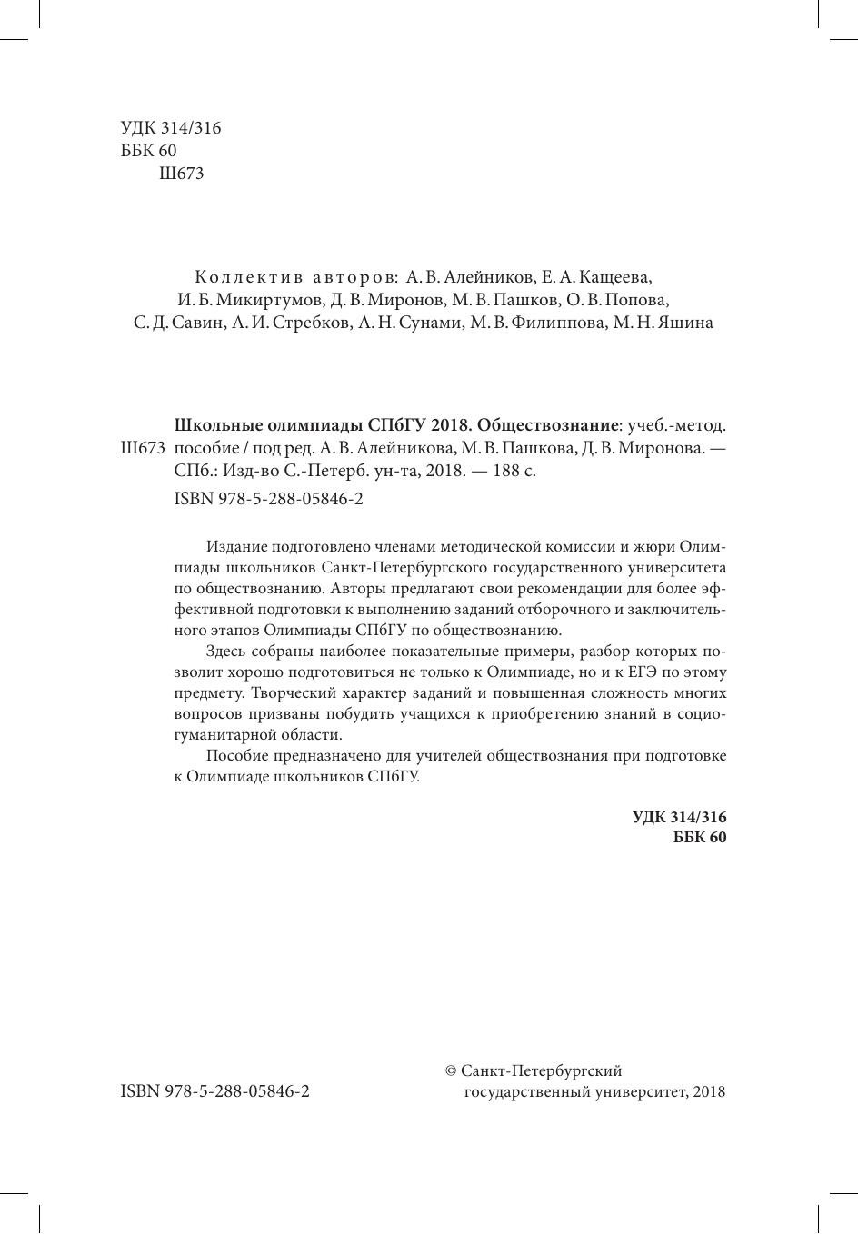 Издание подготовлено членами методической комиссии и жюри Олимпиады школьников Санкт-Петербургского государственного университета по обществознанию. Авторы предлагают свои рекомендации для более эффективной подготовки к выполнению заданий отборочного и заключительного этапов Олимпиады СПбГУ по обществознанию. Здесь собраны наиболее показательные примеры, разбор которых позволит хорошо подготовиться не только к Олимпиаде, но и к ЕГЭ по этому предмету. Творческий характер заданий и повышенная сложность многих вопросов призваны побудить учащихся к приобретению знаний в социогуманитарной области. Пособие предназначено для учителей обществознания при подготовке к Олимпиаде школьников СПбГУ.