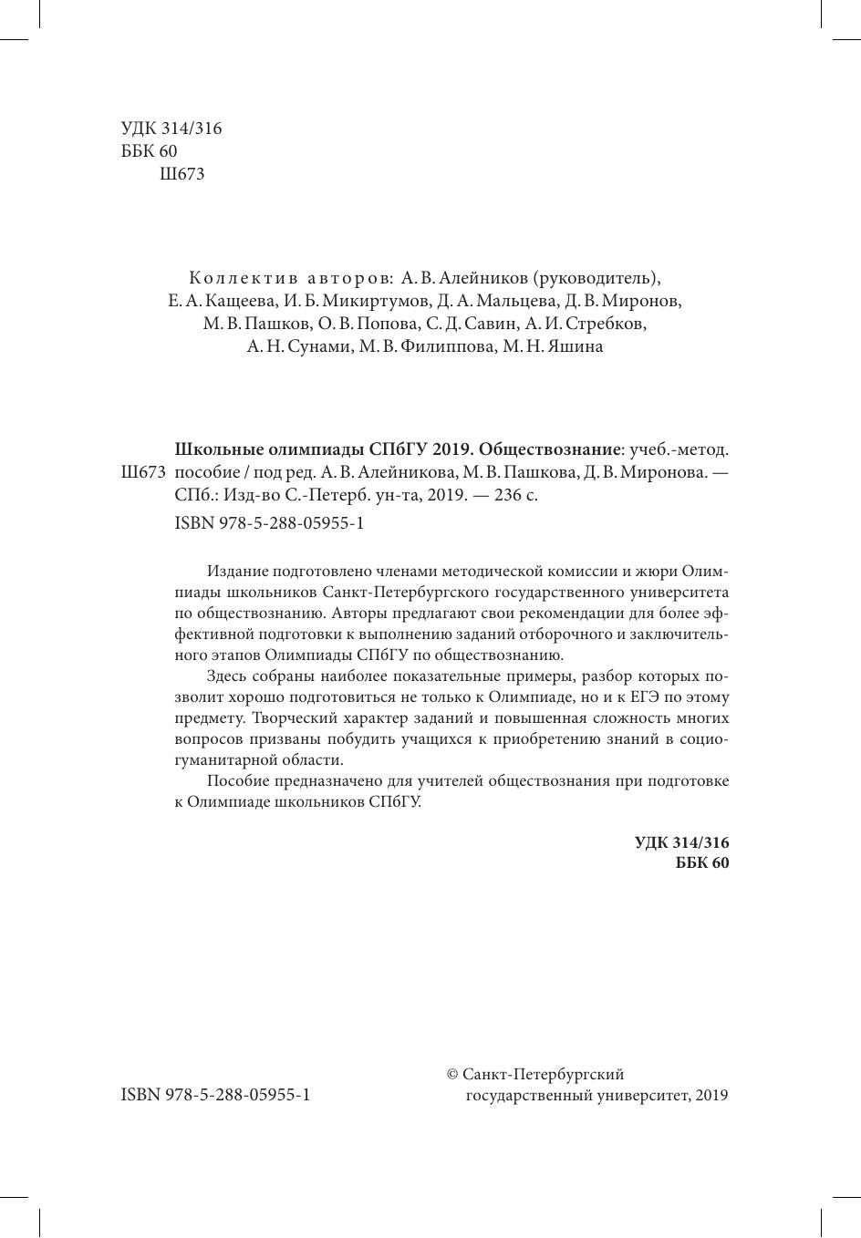 Издание подготовлено членами методической комиссии и жюри Олимпиады школьников Санкт-Петербургского государственного университета по обществознанию. Авторы предлагают свои рекомендации для более эффективной подготовки к выполнению отборочного и заключительного этапов Олимпиады СПбГУ по обществознанию. Здесь собраны наиболее показательные примеры, разбор которых позволит хорошо подготовиться не только к олимпиаде, но и к ЕГЭ по этому предмету. творческий характер заданий и повышенная сложность многих вопросов призваны побудить учащихся к приобретению знаний в социогуманитарной области