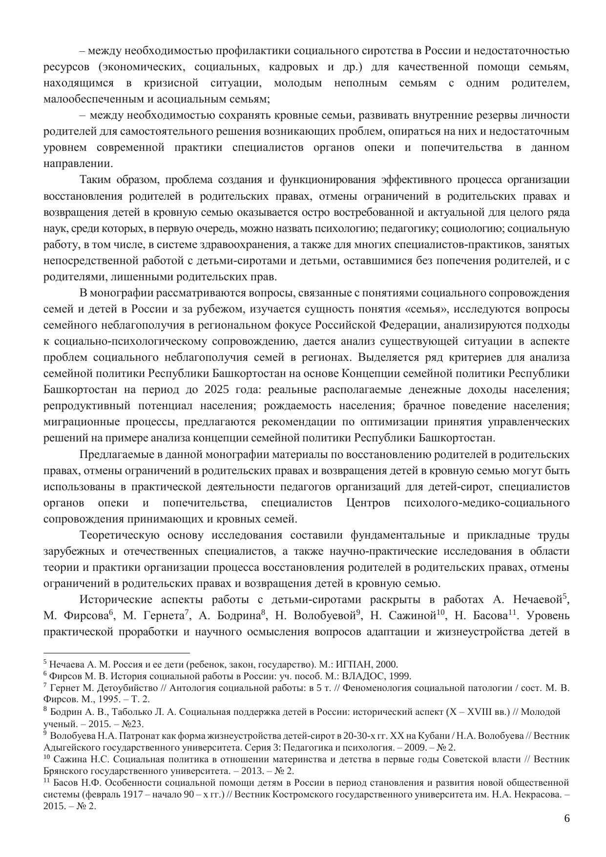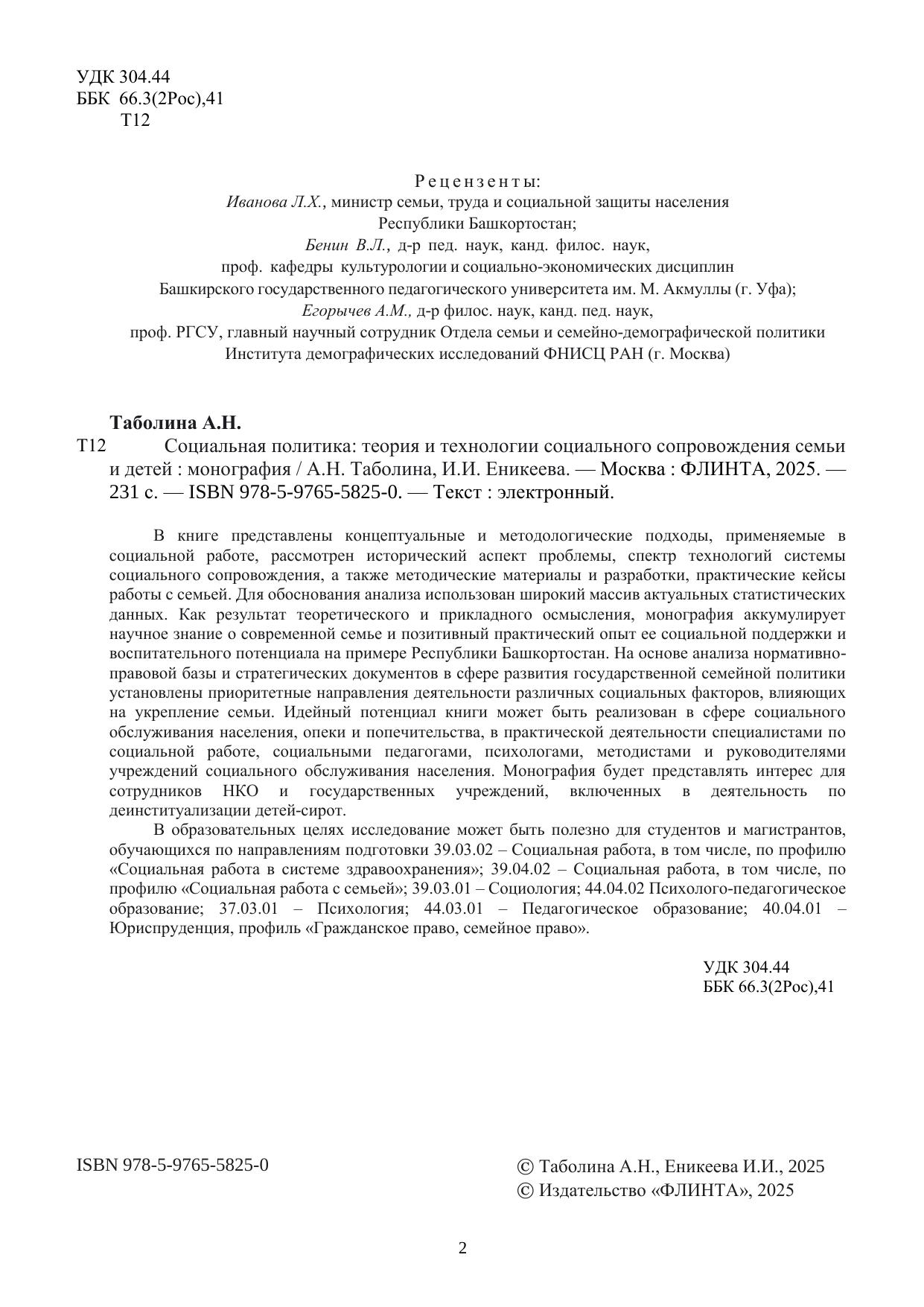 В монографии представлены концептуальные и методологические подходы, применяемые в социальной работе, рассмотрен исторический аспект проблемы, спектр технологий системы социального сопровождения, а также методические материалы и разработки, практические кейсы работы с семьей. Для обоснования анализа использован широкий массив актуальных статистических данных. Как результат теоретического и прикладного осмысления, монография аккумулирует научное знание о современной семье и позитивный практический опыт ее социальной поддержки и воспитательного потенциала на примере Республики Башкортостан. На основе анализа нормативно-правовой базы и стратегических документов в сфере развития государственной семейной политики установлены приоритетные направления деятельности различных социальных факторов, влияющих на укрепление семьи. Идейный потенциал книги может быть реализован в сфере социального обслуживания населения, опеки и попечительства, в практической деятельности специалистами по социальной работе, социальными педагогами, психологами, методистами и руководителями учреждений социального обслуживания населения. Монография будет представлять интерес для сотрудников НКО и государственных учреждений, включенных в деятельность по деинституализации детей-сирот. В образовательных целях исследование может быть полезно для студентов и магистрантов, обучающихся по направлениям подготовки 39.03.02 – Социальная работа, в том числе, по профилю «Социальная работа в системе здравоохранения»; 39.04.02 – Социальная работа, в том числе, по профилю «Социальная работа с семьей»; 39.03.01 – Социология; 44.04.02 Психолого-педагогическое образование; 37.03.01 – Психология; 44.03.01 – Педагогическое образование; 40.04.01 – Юриспруденция, профиль «Гражданское право, семейное право».