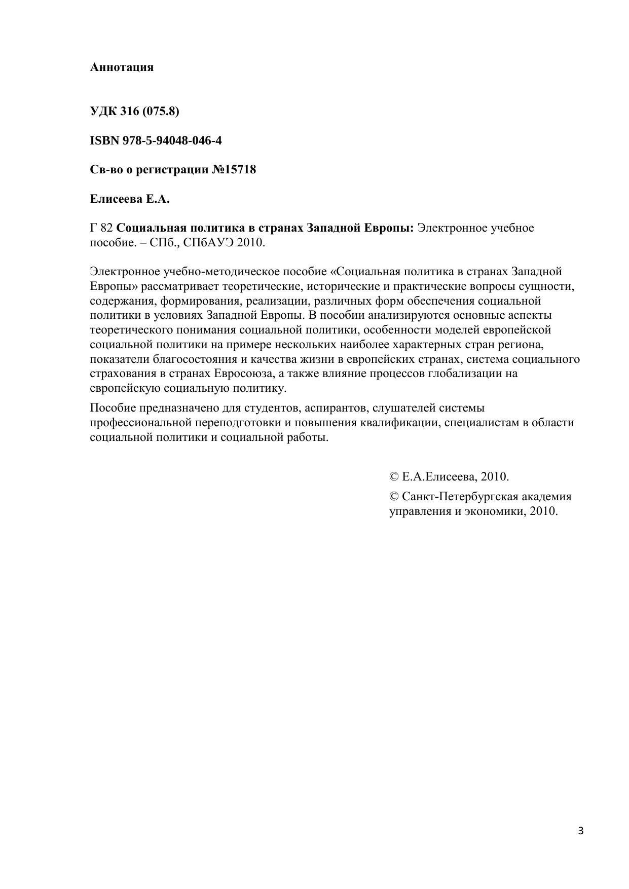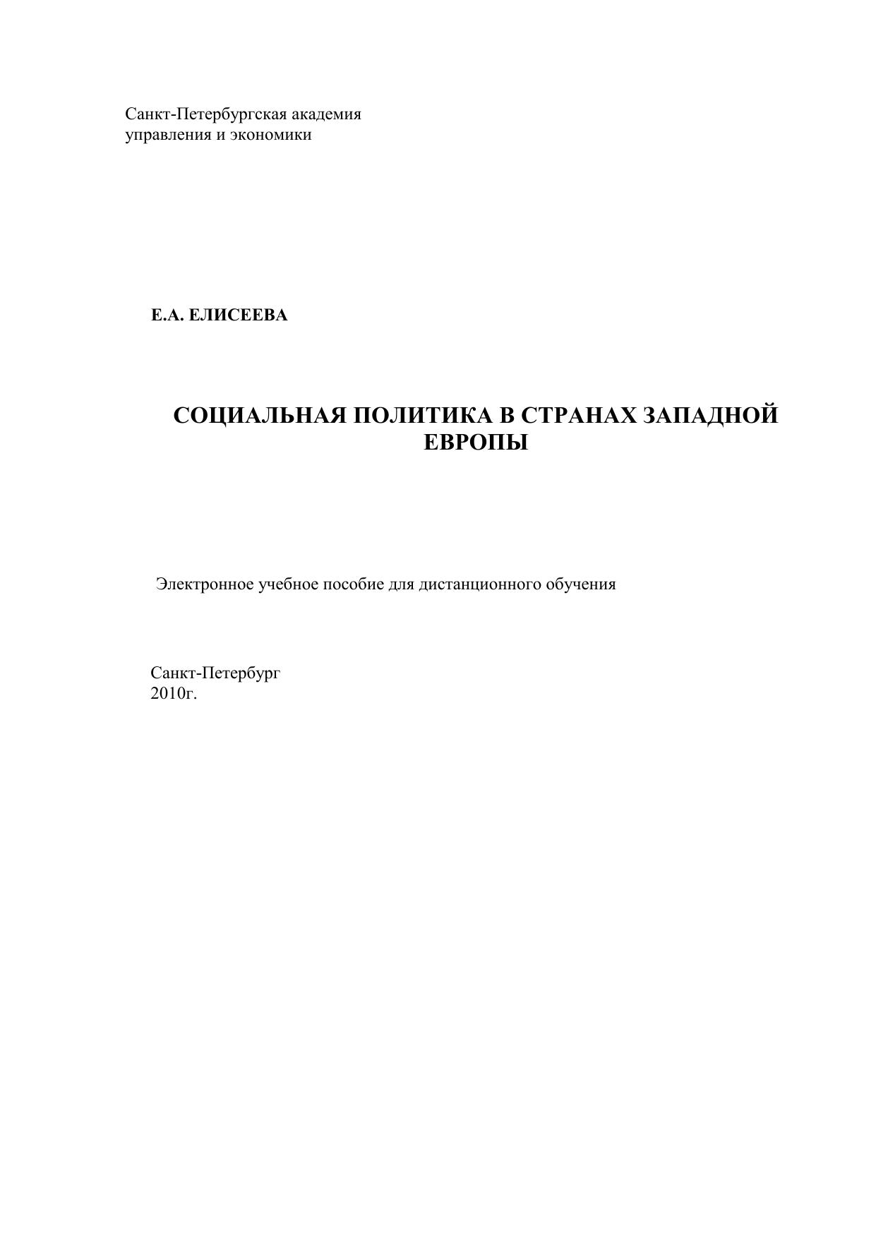 Электронное учебно-методическое пособие «Социальная политика в странах Западной Европы» рассматривает теоретические, исторические и практические вопросы сущности, содержания, формирования, реализации, различных форм обеспечения социальной политики в условиях Западной Европы. В пособии анализируются основные аспекты теоретического понимания социальной политики, особенности моделей европейской социальной политики на примере нескольких наиболее характерных стран региона, показатели благосостояния и качества жизни в европейских странах, система социального страхования в странах Евросоюза, а также влияние процессов глобализации на европейскую социальную политику. Пособие предназначено для студентов, аспирантов, слушателей системы профессиональной переподготовки и повышения квалификации, специалистам в области социальной политики и социальной работы.