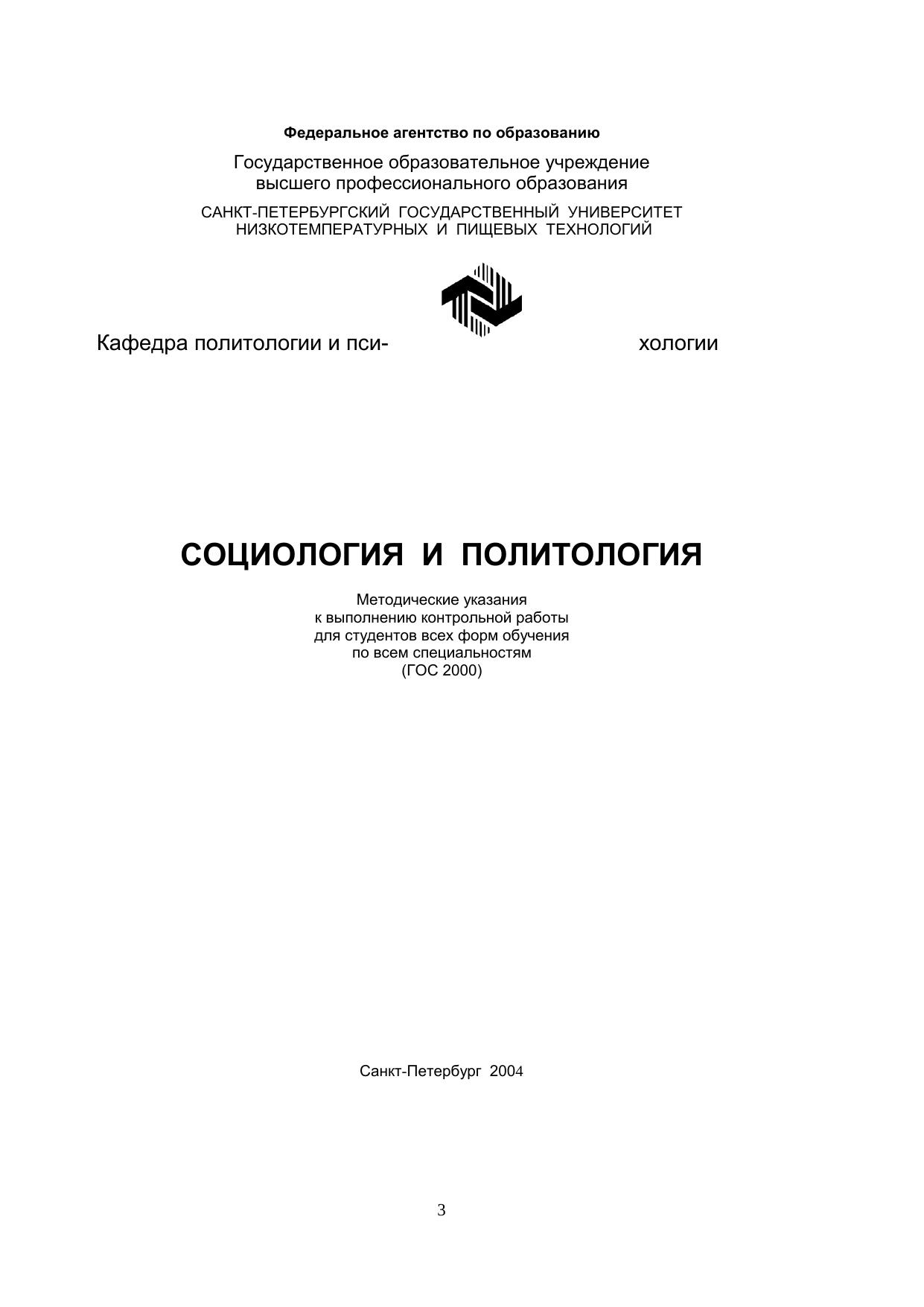 Социология и политология: Методические указания к выполнению контрольной работы для студентов всех форм обучения по всем специальностям (ГОС 2000)