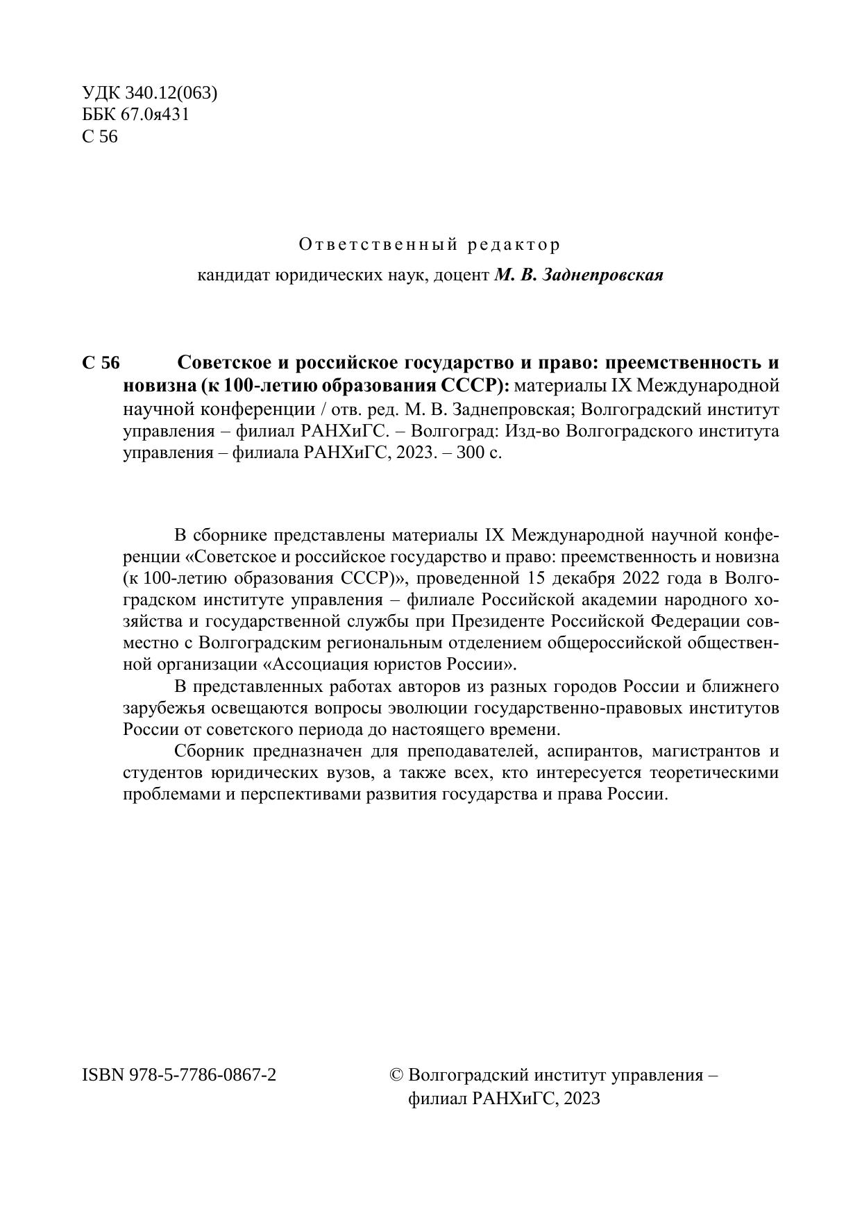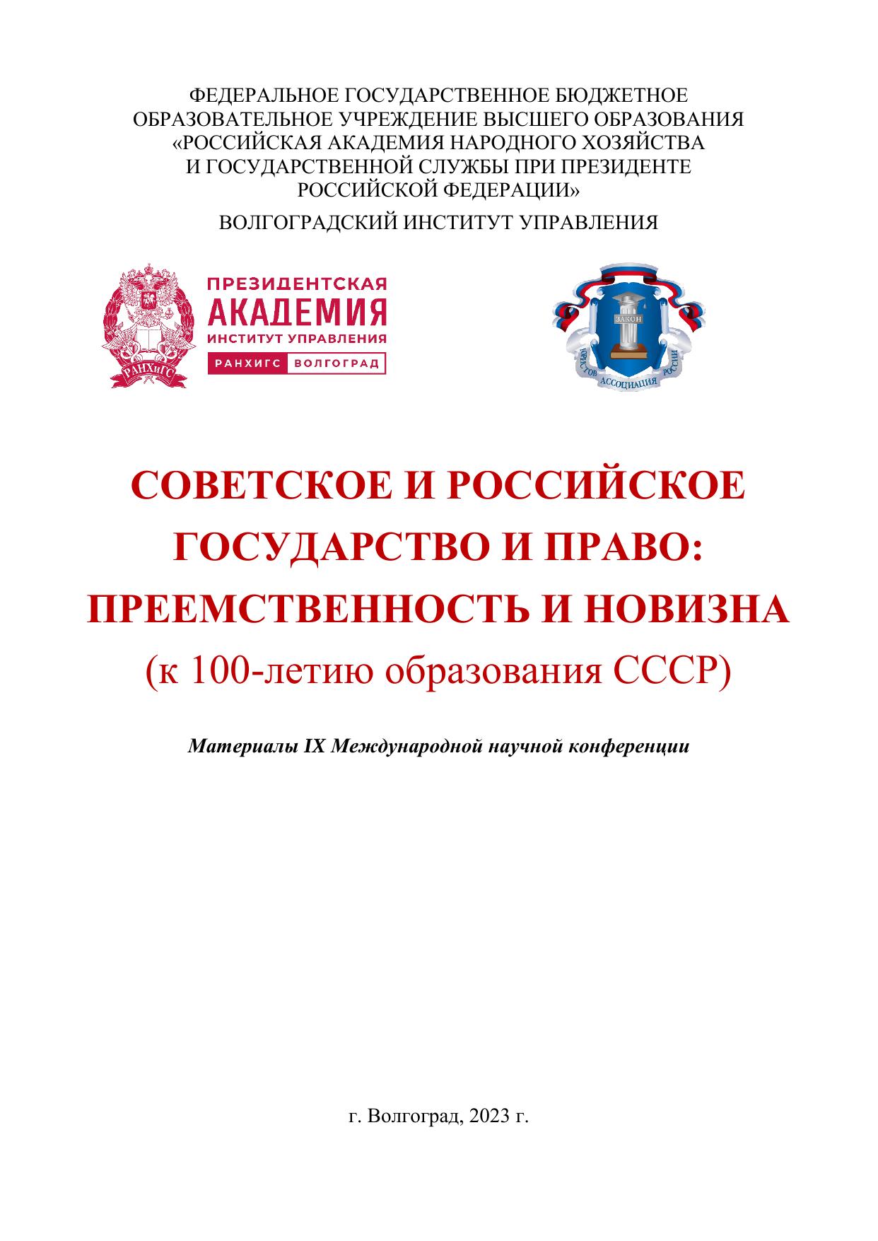В сборнике представлены материалы IX Международной научной конференции «Советское и российское государство и право: преемственность и новизна (к 100-летию образования СССР)», проведенной 15 декабря 2022 года в Волгоградском институте управления – филиале Российской академии народного хозяйства и государственной службы при Президенте Российской Федерации совместно с Волгоградским региональным отделением общероссийской общественной организации «Ассоциация юристов России». В представленных работах авторов из разных городов России и ближнего зарубежья освещаются вопросы эволюции государственно-правовых институтов России от советского периода до настоящего времени. Сборник предназначен для преподавателей, аспирантов, магистрантов и студентов юридических вузов, а также всех, кто интересуется теоретическими проблемами и перспективами развития государства и права России.
