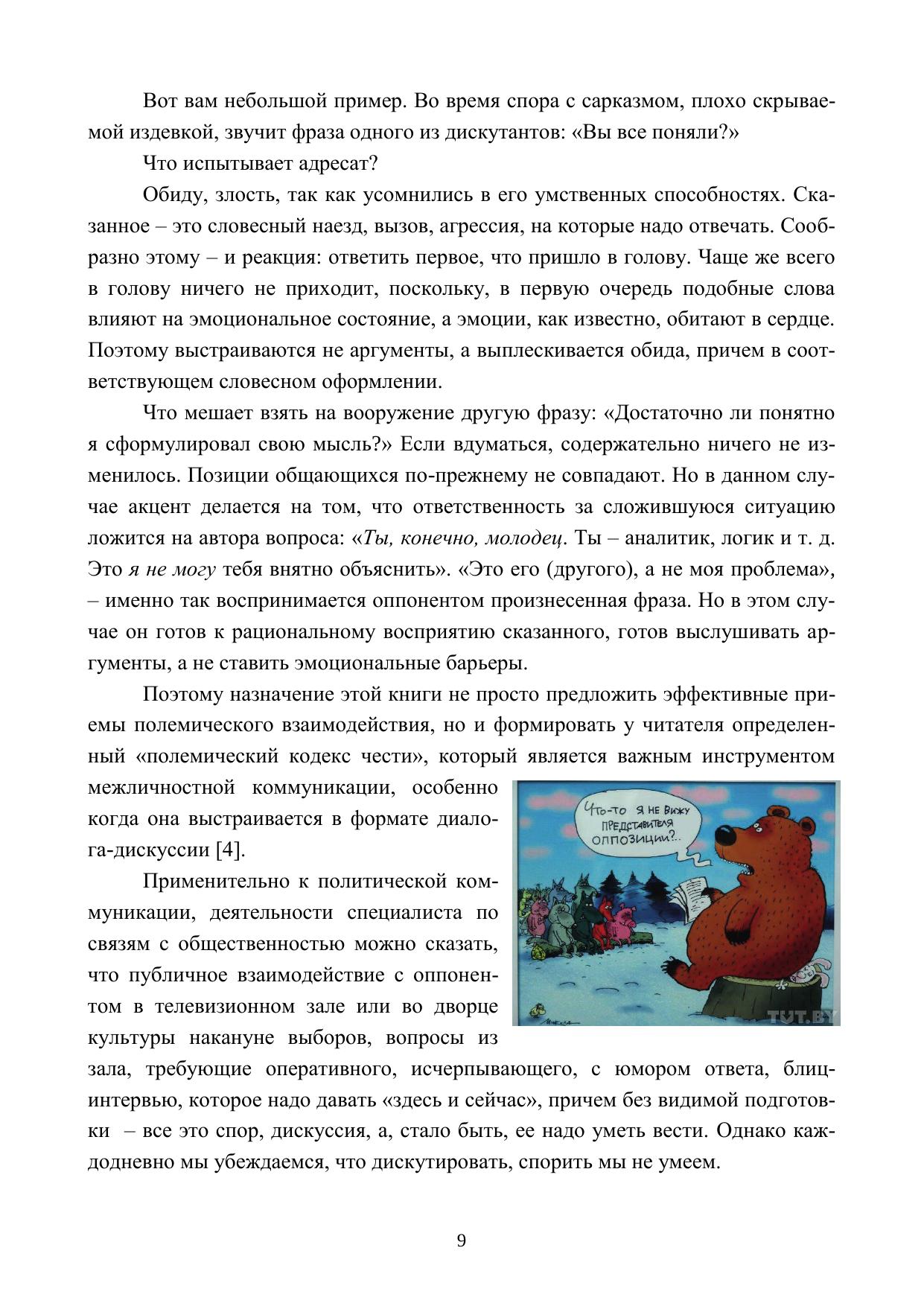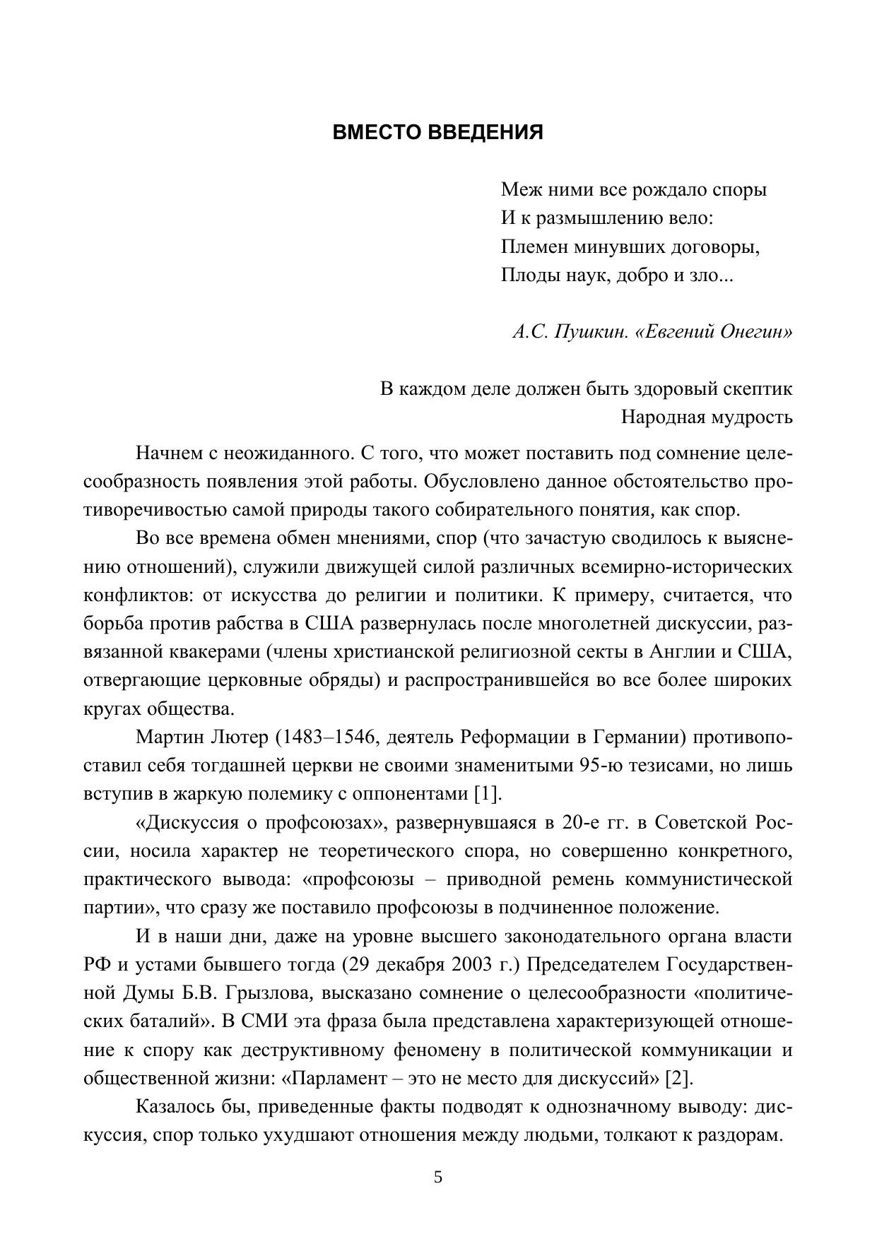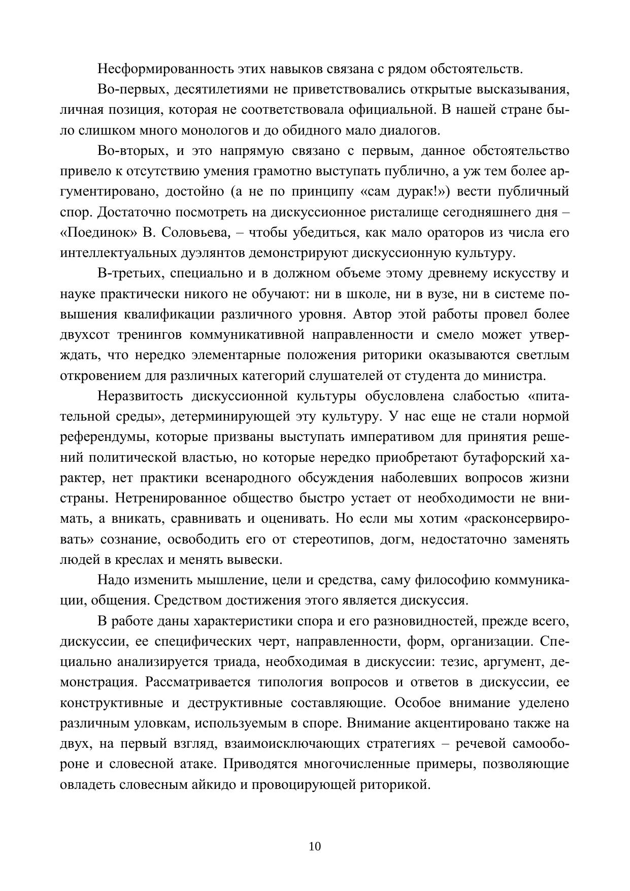 В работе даны характеристики спора и его разновидностей, прежде всего, дискуссии, ее специфических черт, направленности, форм, организации. Специально анализируется триада, необходимая в дискуссии: тезис, аргумент, демонстрация. Рассматривается типология вопросов и ответов в дискуссии, ее конструктивные и деструктивные составляющие. Особое внимание уделено различным уловкам, используемым в споре. Внимание акцентировано также на двух, на первый взгляд, взаимоисключающих стратегиях – речевой самообороне и словесной атаке. Приводятся многочисленные примеры, позволяющие овладеть словесным айкидо и провоцирующей риторикой. Предметом исследования выступает также алгоритм подготовки и проведения дискуссии, роль ведущего дискуссии, те «нештатные» ситуации, которые могут возникнуть в ходе спора, и способы их разрешения. Практико-ориентированные разделы работы содержат разнообразные творческие задания и упражнения, разработанные и применяемые автором в коммуникативных тренингах «Слово предоставлено Вам…» и «Спор? Спор…Спор!», а также взятые из литературных и интернет-источников. Руководство предназначено для бакалавров и магистров коммуникативно-ориентированных специальностей, работающих в политической сфере, для политических лидеров, политиков и всех, кто интересуется и занимается публичными политическими коммуникациями.