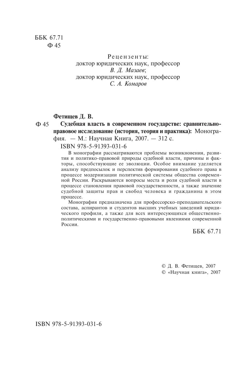 В монографии рассматриваются проблемы возникновения, развития и политико-правовой природы судебной власти, причины и факторы, способствующие ее эволюции. Особое внимание уделяется анализу предпосылок и перспектив формирования судебного права в процессе модернизации политической системы общества современной России. Раскрываются вопросы места и роли судебной власти в процессе становления правовой государственности, а также значение судебной защиты прав и свобод человека и гражданина в этом процессе. Монография предназначена для профессорско-преподавательского состава, аспирантов и студентов высших учебных заведений юридического профиля, а также для всех интересующихся общественно-политическими и государственно?правовыми явлениями современной России.