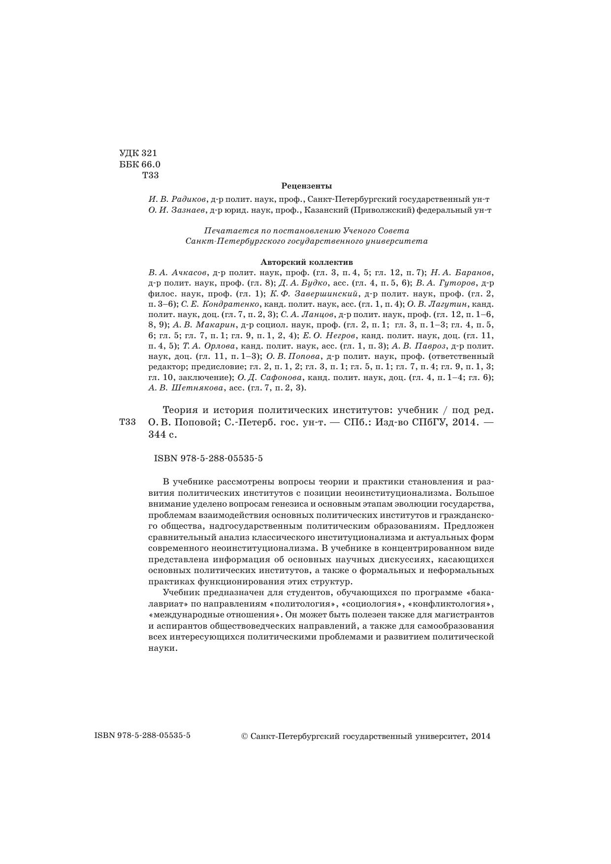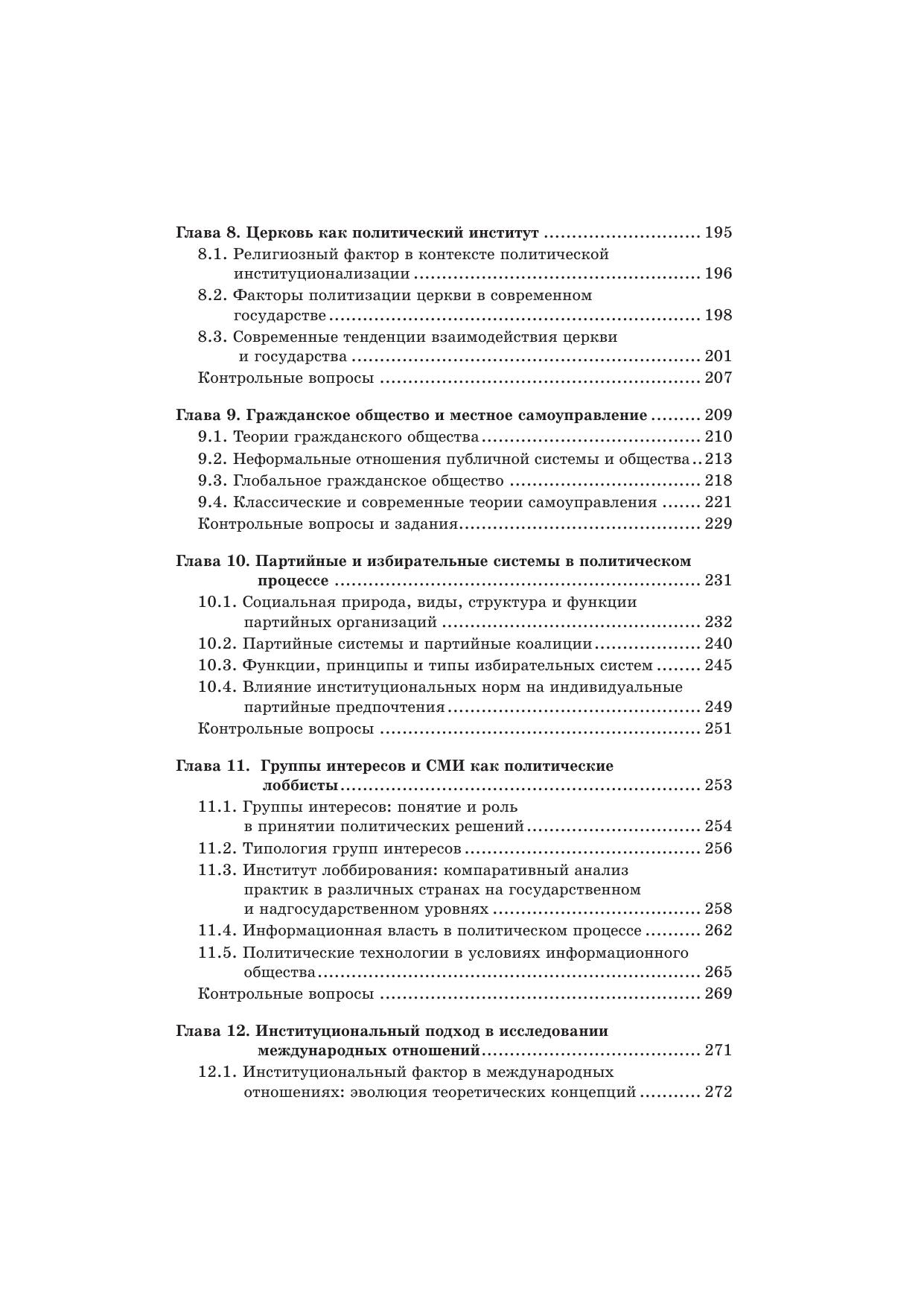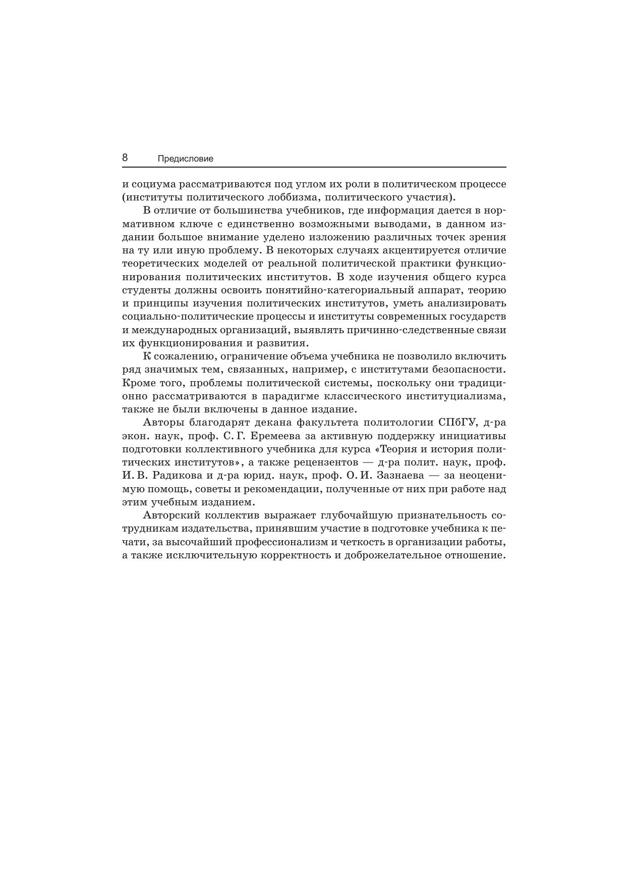 В учебнике рассмотрены вопросы теории и практики становления и развития политических институтов с позиции неоинституционализма. Большое внимание уделено вопросам генезиса и основным этапам эволюции государства, проблемам взаимодействия основных политических институтов и гражданского общества, надгосударственным политическим образованиям. Предложен сравнительный анализ классического институционализма и актуальных форм современного неоинституционализма. В учебнике в концентрированном виде представлена информация об основных научных дискуссиях, касающихся основных политических институтов, а также о формальных и неформальных практиках функционирования этих структур.