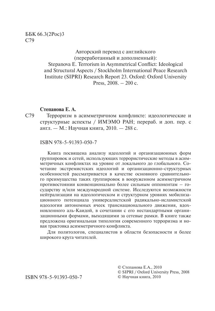 Книга посвящена анализу идеологий и организационных форм группировок и сетей, использующих террористические методы в асимметричных конфликтах на уровне от локального до глобального. Сочетание экстремистских идеологий и организационно-структурных особенностей рассматривается в качестве основного сравнительного преимущества таких группировок в вооруженном асимметричном противостоянии конвенционально более сильным оппонентам – государству и/или международной системе. Исследуются возможности нейтрализации на идеологическом и структурном уровнях мобилизационного потенциала универсалистской радикально-исламистской идеологии автономных ячеек транснационального движения, вдох- новленного аль-Каидой, в сочетании с его нестандартными организационными формами, выходящими за сетевые рамки. В книге также предложена оригинальная типология современного терроризма и новая трактовка асимметричного конфликта. Для политологов, специалистов в области безопасности и более широкого круга читателей.