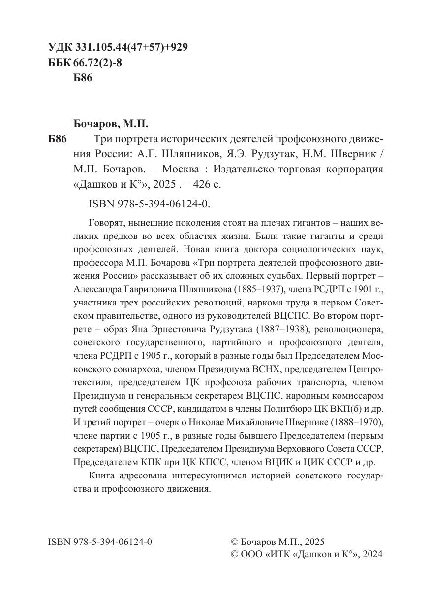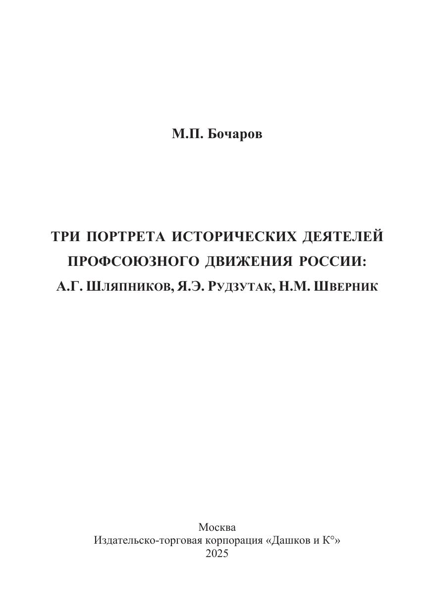 Говорят, нынешние поколения стоят на плечах гигантов – наших великих предков во всех областях жизни. Были такие гиганты и среди профсоюзных деятелей. Новая книга доктора социологических наук, профессора М.П. Бочарова «Три портрета деятелей профсоюзного движения России» рассказывает об их сложных судьбах. Первый портрет – Александра Гавриловича Шляпникова (1885–1937), члена РСДРП с 1901 г., участника трех российских революций, наркома труда в первом Советском правительстве, одного из руководителей ВЦСПС. Во втором портрете – образ Яна Эрнестовича Рудзутака (1887–1938), революционера, советского государственного, партийного и профсоюзного деятеля, члена РСДРП с 1905 г., который в разные годы был Председателем Московского совнархоза, членом Президиума ВСНХ, председателем Центротекстиля, председателем ЦК профсоюза рабочих транспорта, членом Президиума и генеральным секретарем ВЦСПС, народным комиссаром путей сообщения СССР, кандидатом в члены Политбюро ЦК ВКП(б) и др. И третий портрет – очерк о Николае Михайловиче Швернике (1888–1970), члене партии с 1905 г., в разные годы бывшего Председателем (первым секретарем) ВЦСПС, Председателем Президиума Верховного Совета СССР, Председателем КПК при ЦК КПСС, членом ВЦИК и ЦИК СССР и др.