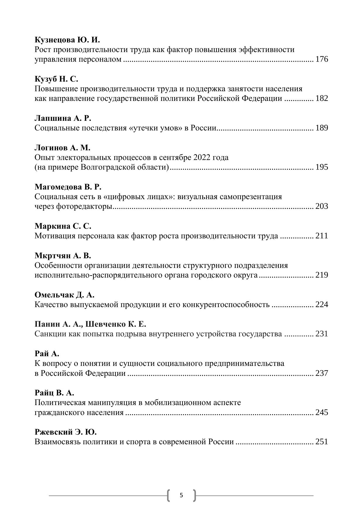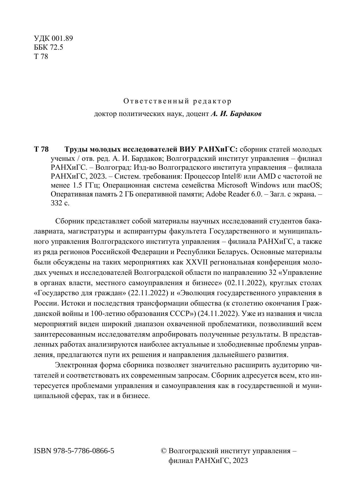 Сборник представляет собой материалы научных исследований студентов бакалавриата, магистратуры и аспирантуры факультета Государственного и муниципального управления Волгоградского института управления – филиала РАНХиГС, а также из ряда регионов Российской Федерации и Республики Беларусь. Основные материалы были обсуждены на таких мероприятиях как XXVII региональная конференция молодых ученых и исследователей Волгоградской области по направлению 32 «Управление в органах власти, местного самоуправления и бизнесе» (02.11.2022), круглых столах «Государство для граждан» (22.11.2022) и «Эволюция государственного управления в России. Истоки и последствия трансформации общества (к столетию окончания Гражданской войны и 100-летию образования СССР») (24.11.2022). Уже из названия и числа мероприятий виден широкий диапазон охваченной проблематики, позволивший всем заинтересованным исследователям апробировать полученные результаты. В представленных работах анализируются наиболее актуальные и злободневные проблемы управления, предлагаются пути их решения и направления дальнейшего развития. Электронная форма сборника позволяет значительно расширить аудиторию читателей и соответствовать их современным запросам. Сборник адресуется всем, кто интересуется проблемами управления и самоуправления как в государственной и муниципальной сферах, так и в бизнесе.