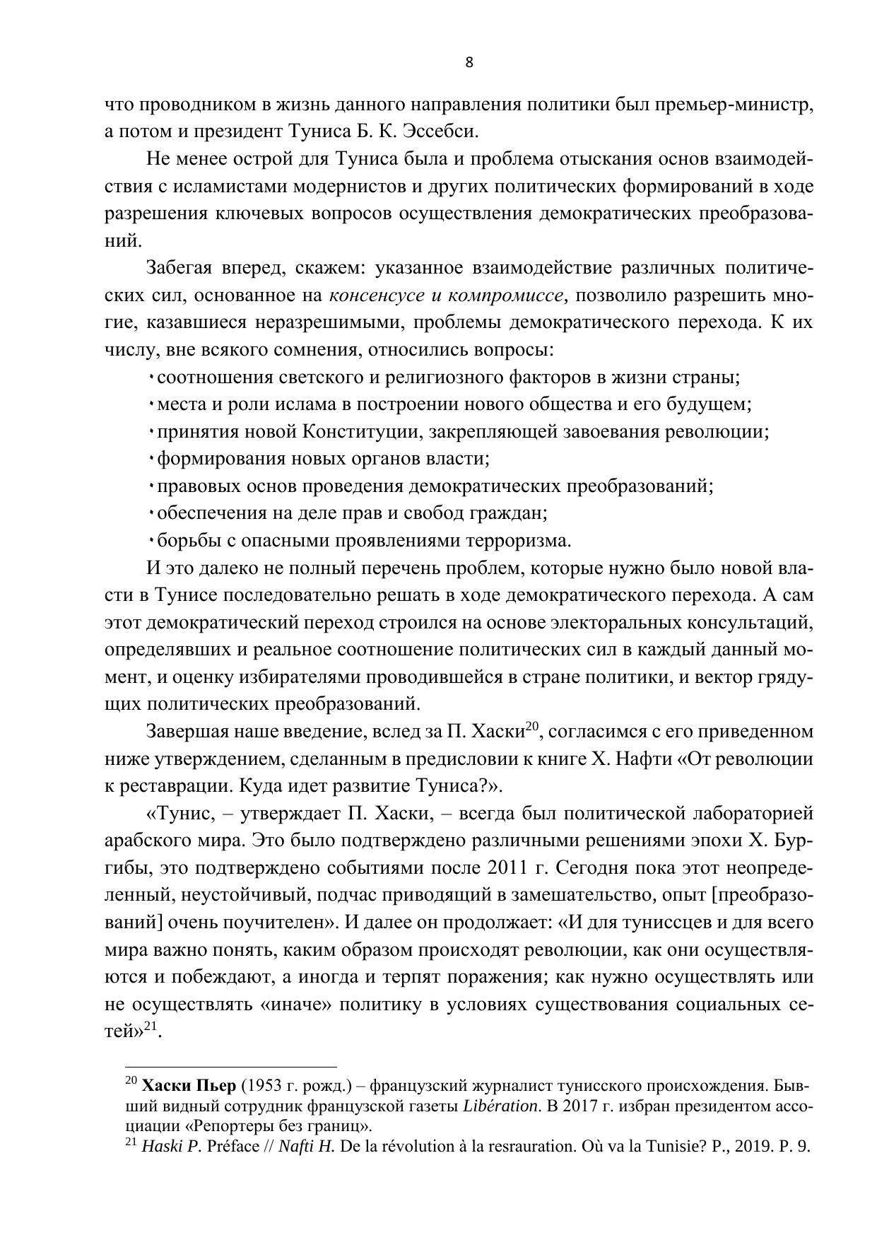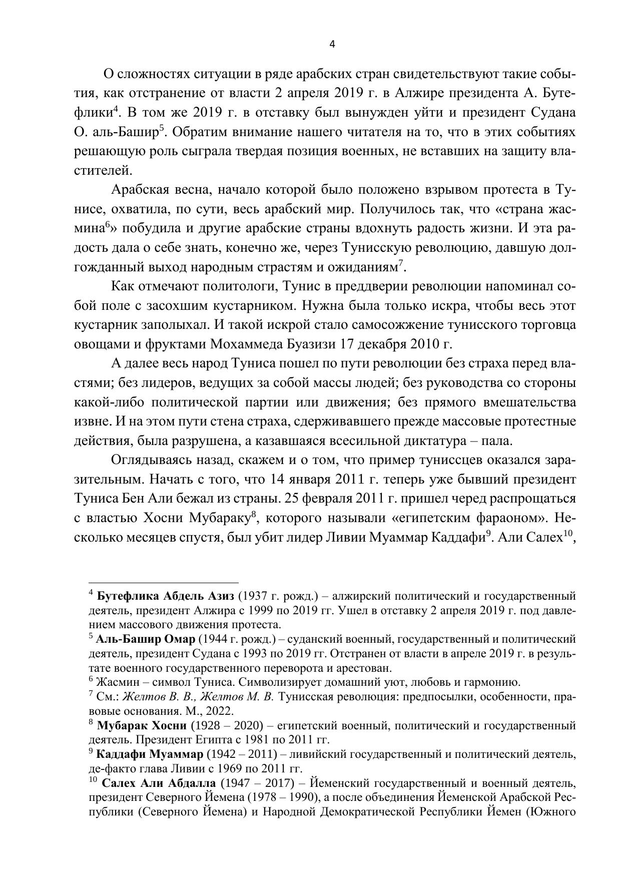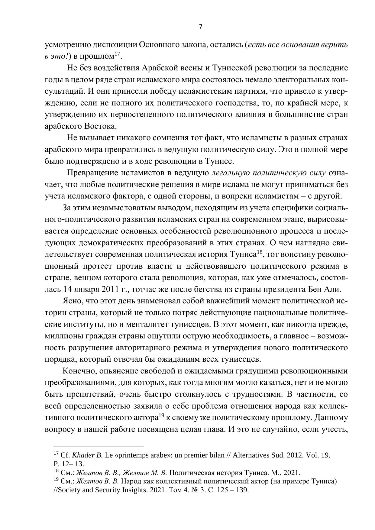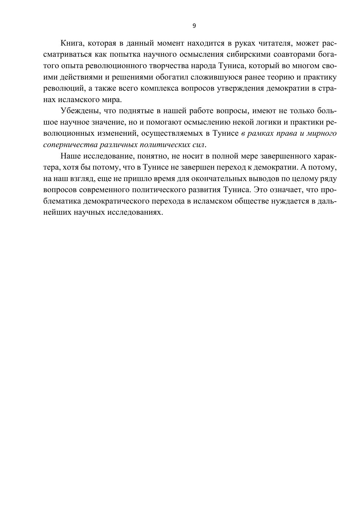 Монография посвящена рассмотрению одной из актуальных проблем политической теории и практики – демократическому переходу мусульманской страны, осуществляемому в Тунисе после победоносной революции свободы и достоинства, которая положила конец антинародному и диктаторскому политическому режиму. Раскрываются отличительные особенности тунисской революции, открывшей для народа Туниса перспективу утверждения демократии и построения новых общественных отношений, основанных на равноправном взаимодействии различных политических сил. Показана политическая логика формирования органов власти в условиях меняющегося соотношения социально-политических сил. Раскрыты роль гражданского общества в преодолении кризиса власти и становлении Национального диалога как инструмента регулирования общественных отношений на пути утверждения демократии. Дана характеристика электоральному процессу и его результатам.