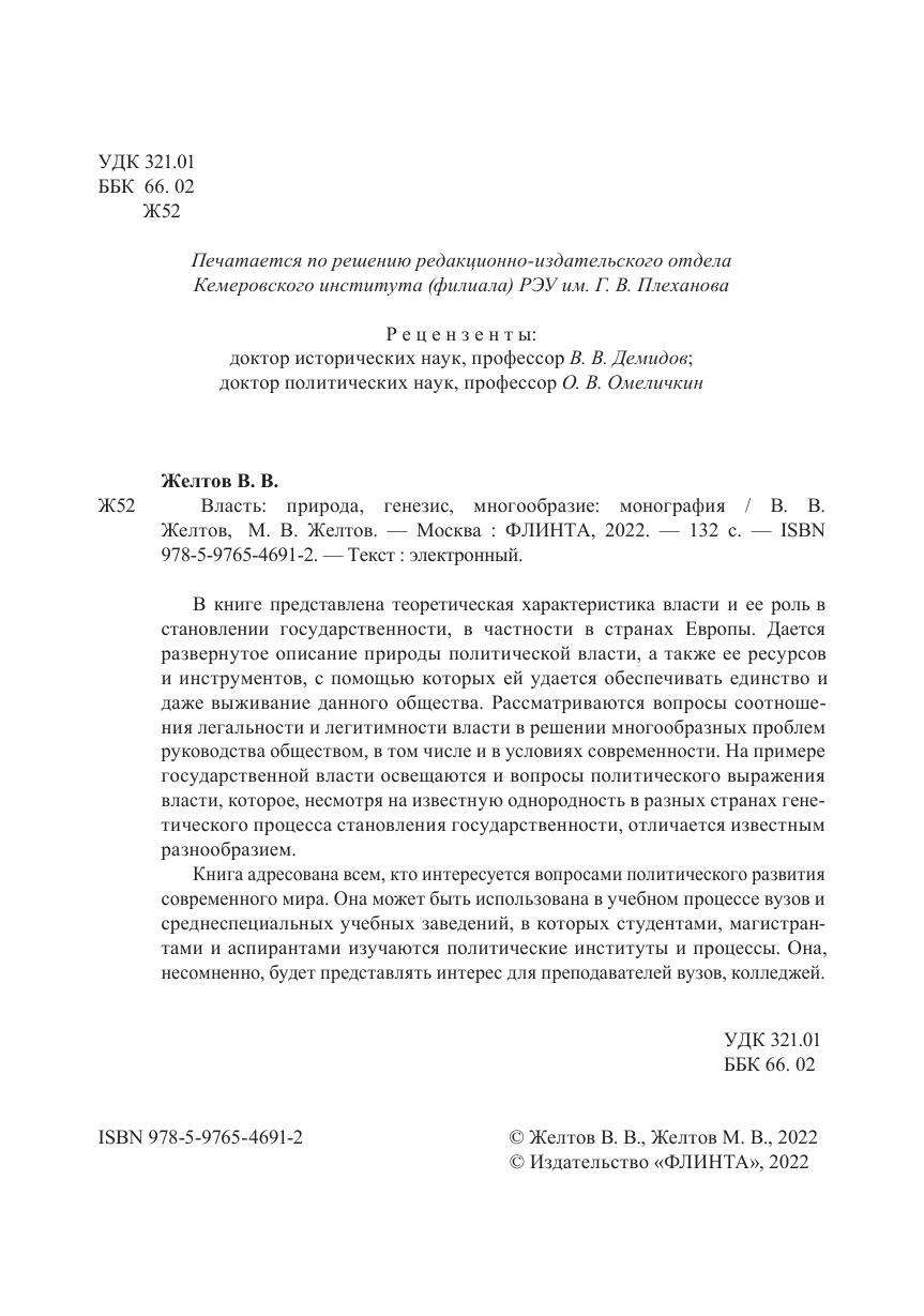 В книге представлена теоретическая характеристика власти и ее роль в становлении государственности, в частности в странах Европы. Дается развернутое описание природы политической власти, а также ее ресурсов и инструментов, с помощью которых ей удается обеспечивать единство и даже выживание данного общества. Рассматриваются вопросы соотношения легальности и легитимности власти в решении многообразных проблем руководства обществом, в том числе и в условиях современности. На примере государственной власти освещаются и вопросы политического выражения власти, которое, несмотря на известную однородность в разных странах гене-тического процесса становления государственности, отличается известным разнообразием.