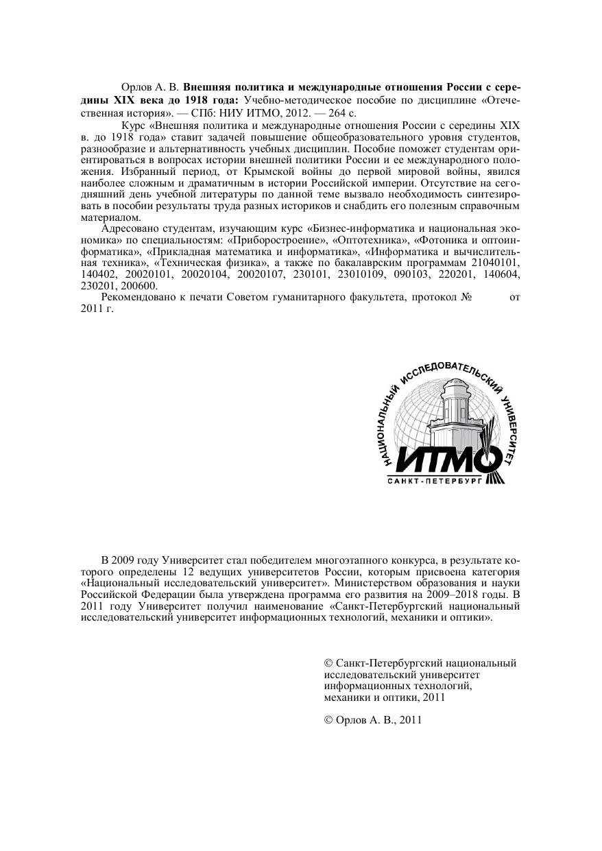 Курс «Внешняя политика и международные отношения России с середины XIX в. до 1918 года» ставит задачей повышение общеобразовательного уровня студентов, разнообразие и альтернативность учебных дисциплин. Пособие поможет студентам ориентироваться в вопросах истории внешней политики России и ее международного положения. Избранный период, от Крымской войны до первой мировой войны, явился наиболее сложным и драматичным в истории Российской империи. Отсутствие на сегодняшний день учебной литературы по данной теме вызвало необходимость синтезировать в пособии результаты труда разных историков и снабдить его полезным справочным материалом. Адресовано студентам, изучающим курс «Бизнес-информатика и национальная экономика» по специальностям: «Приборостроение», «Оптотехника», «Фотоника и оптоинформатика», «Прикладная математика и информатика», «Информатика и вычислительная техника», «Техническая физика», а также по бакалаврским программам 21040101, 140402, 20020101, 20020104, 20020107, 230101, 23010109, 090103, 220201, 140604, 230201, 200600.