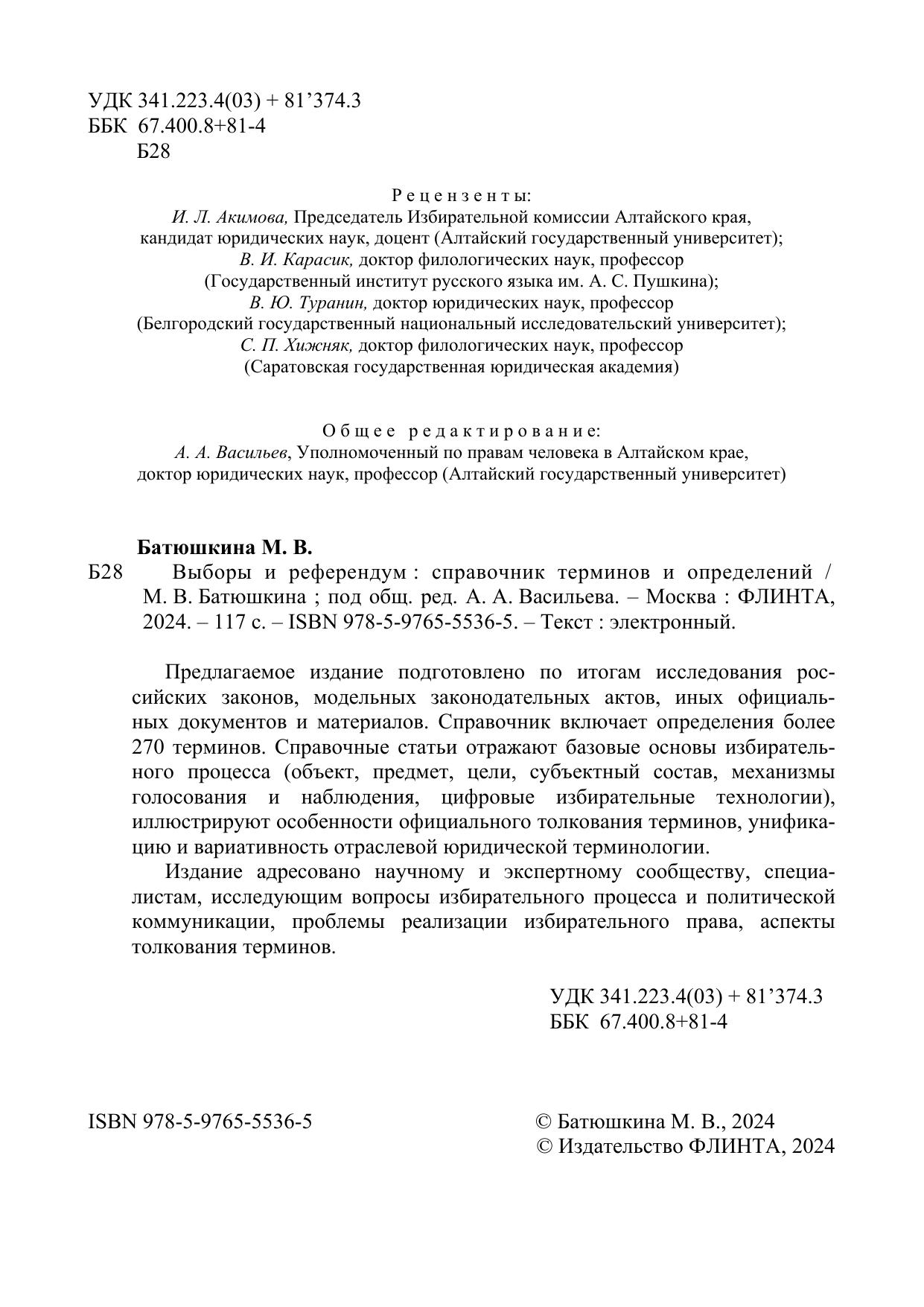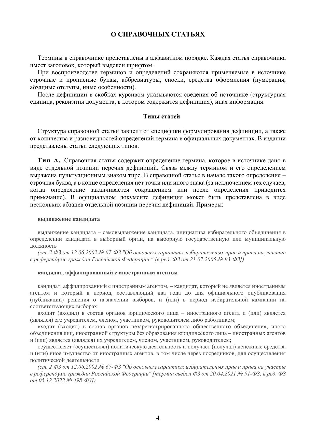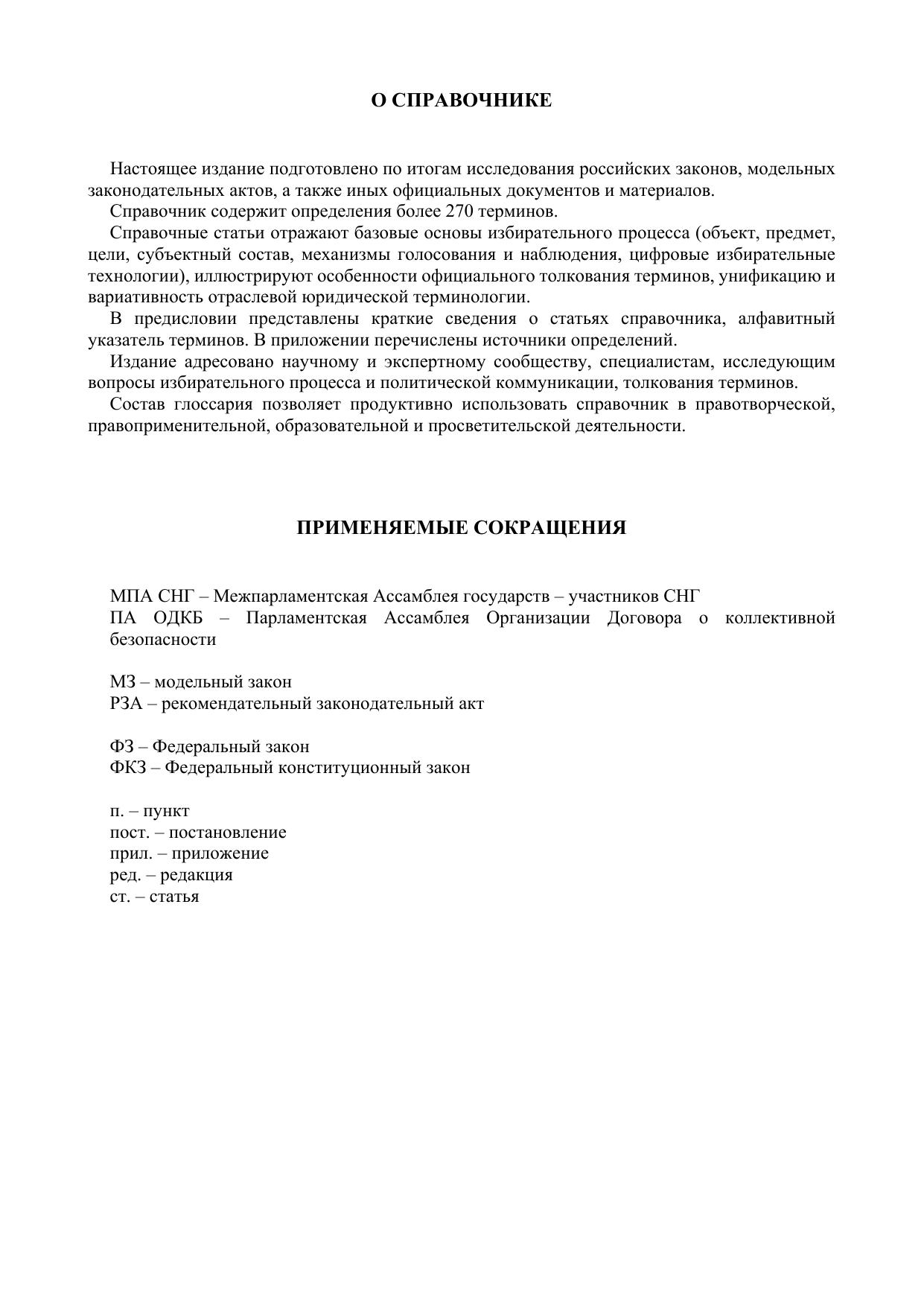 Предлагаемое издание подготовлено по итогам исследования российских законов, модельных законодательных актов, иных официальных документов и материалов. Справочник включает определения более 270 терминов. Справочные статьи отражают базовые основы избирательного процесса (объект, предмет, цели, субъектный состав, механизмы голосования и наблюдения, цифровые избирательные технологии), иллюстрируют особенности официального толкования терминов, унификацию и вариативность отраслевой юридической терминологии.