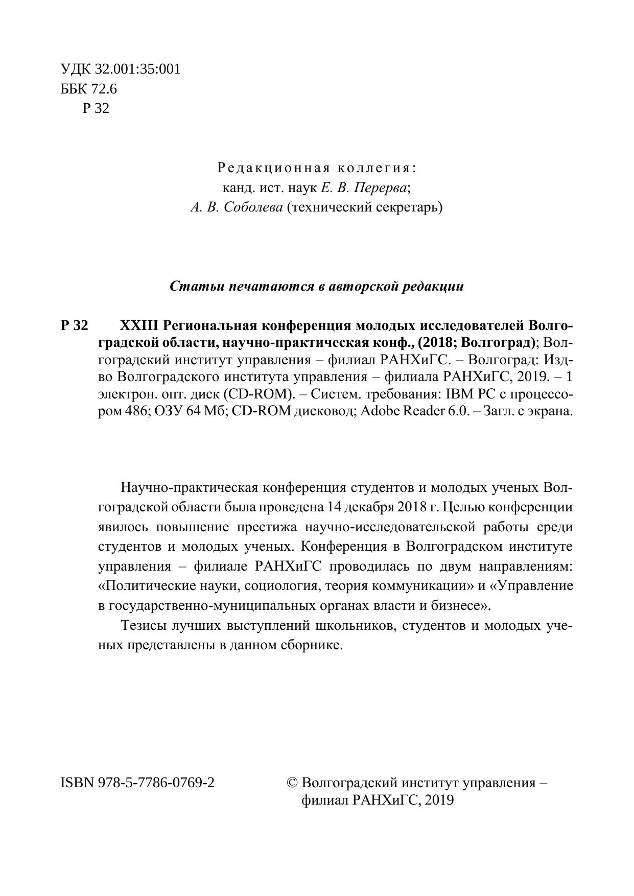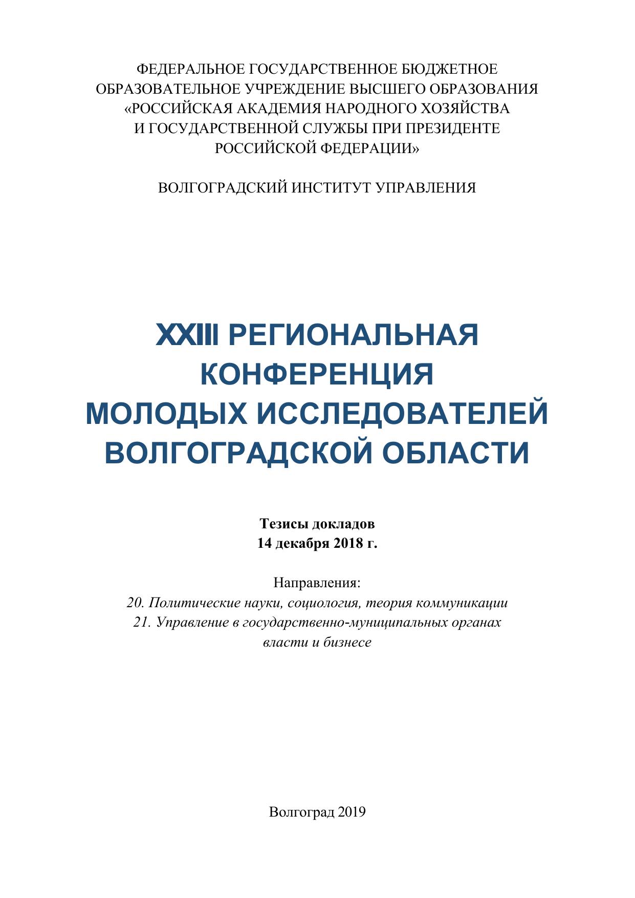 Научно-практическая конференция студентов и молодых ученых Вол-гоградской области была проведена 14 декабря 2018 г. Целью конференции явилось повышение престижа научно-исследовательской работы среди студентов и молодых ученых. Конференция в Волгоградском институте управления – филиале РАНХиГС проводилась по двум направлениям: «Политические науки, социология, теория коммуникации» и «Управление в государственно-муниципальных органах власти и бизнесе». Тезисы лучших выступлений школьников, студентов и молодых уче-ных представлены в данном сборнике.