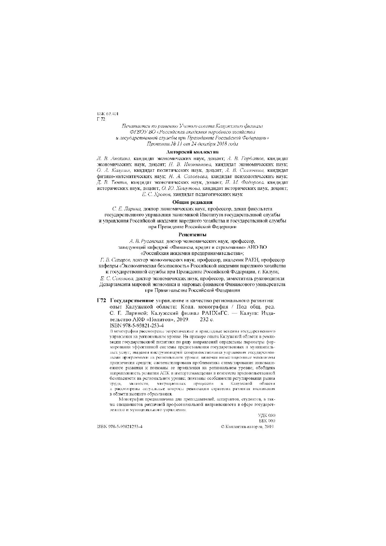 В монографии рассмотрены теоретические и прикладные аспекты государственного управления на региональном уровне. На примере оп^1та Калужской области в реализации государственной политики по ряду направлений определена: параметры формирования эффективной системы предоставления государственн^1х и муниципальн^1х услуг; выделен инструментарий совершенствования управления государственн^1ми программами на региональном уровне, включая инвестиционные механизмы привлечения средств; систематизирована проблематика стимулирования инновационного развития и показаны ее проявления на региональном уровне; обобщена направленность развития АПК и импортозамещения в контексте продовольственной безопасности на региональном уровне; показаны особенности регулирования рынка труда, занятости, миграционных процессов в Калужской области и рассмотрены актуальн^1е вопросы реализации стратегии развития воспитания в области высшего образования. Монография предназначена для преподавателей, аспирантов, студентов, а также специалистов различной профессиональной направленности в сфере государственного и муниципального управления.
