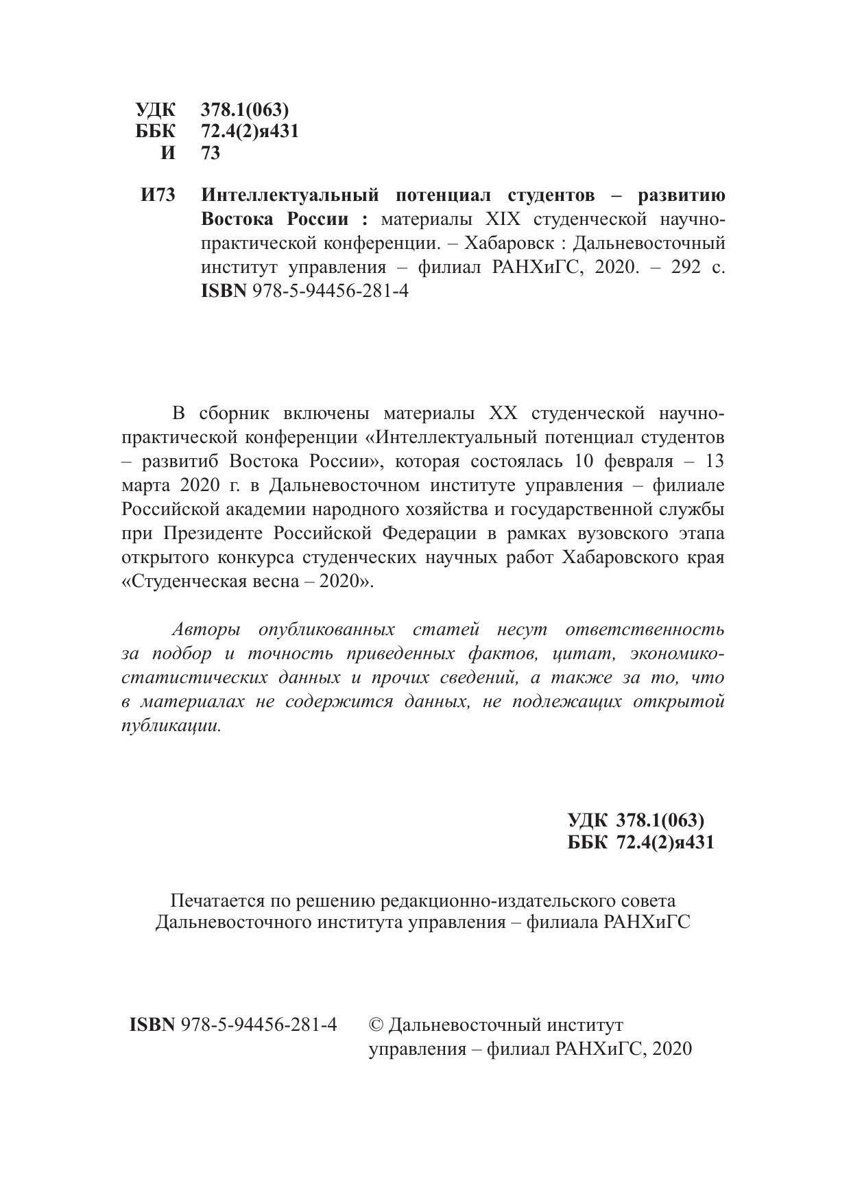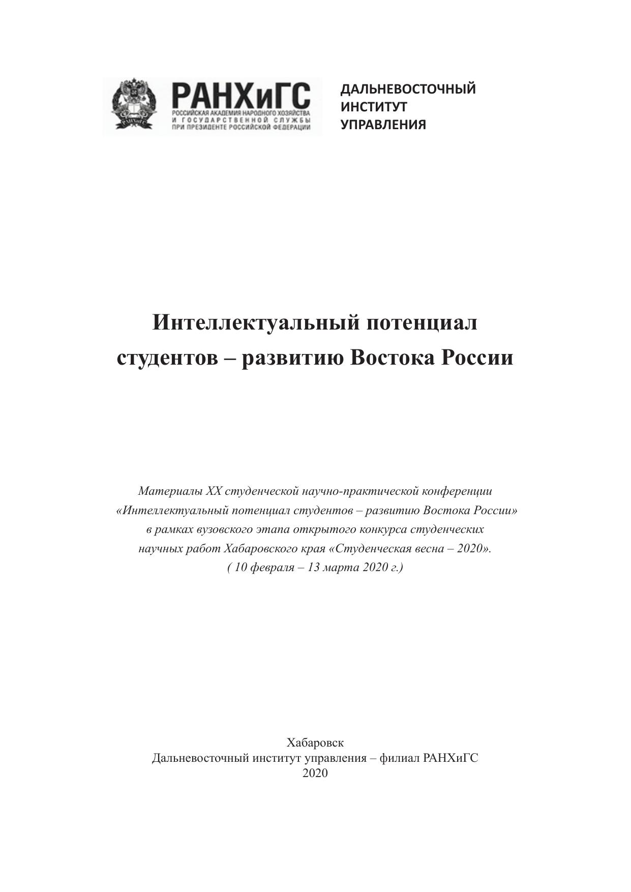В сборник включены материалы XX студенческой научнопрактической конференции «Интеллектуальный потенциал студентов – развитиб Востока России», которая состоялась 10 февраля – 13 марта 2020 г. в Дальневосточном институте управления – филиале Российской академии народного хозяйства и государственной службы при Президенте Российской Федерации в рамках вузовского этапа открытого конкурса студенческих научных работ Хабаровского края «Студенческая весна – 2020»