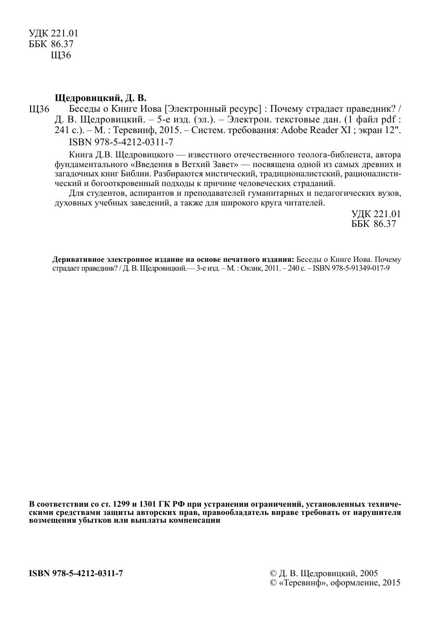 Книга Д.В. Щедровицкого — известного отечественного теолога-библеиста, автора фундаментального «Введения в Ветхий Завет» — посвящена одной из самых древних и загадочных книг Библии. Разбираются мистический, традиционалистский, рационалистический и богооткровенный подходы к причине человеческих страданий.