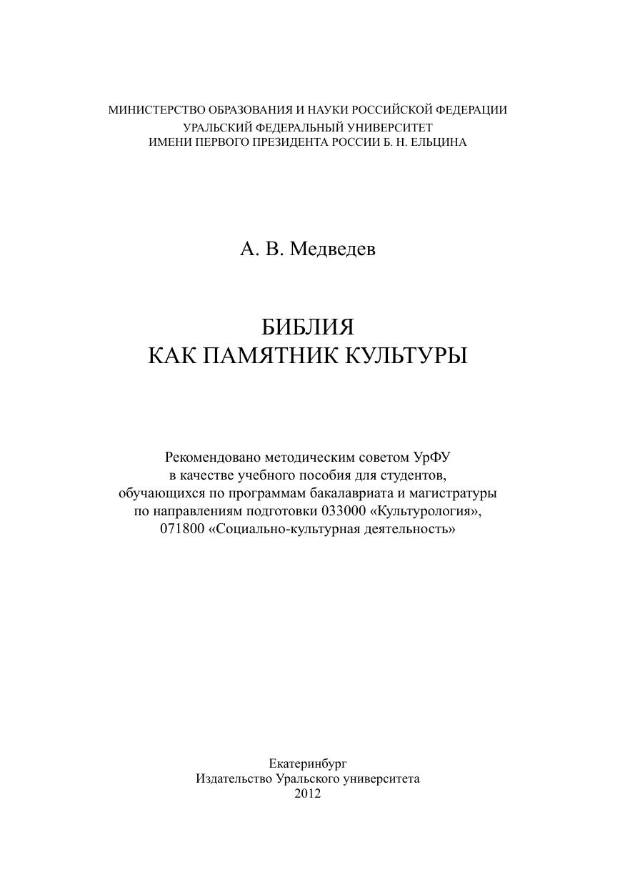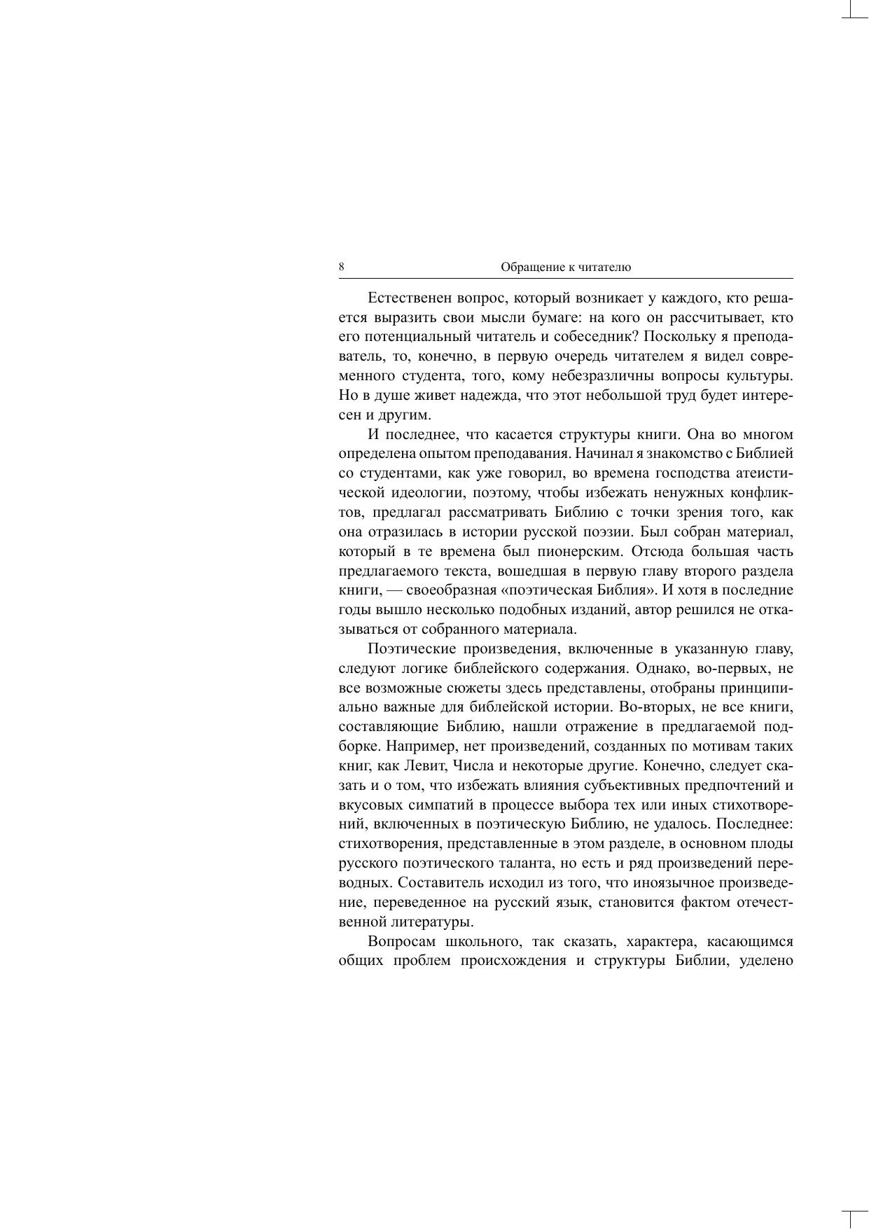 Учебное пособие посвящено анализу Библии как целостного памятника культуры, оказавшего огромное влияние на культуры христианского мира, на русскую культуру в том числе. В нем рассматривается история создания библейского текста, выделяется четыре взгляда на Библию: она характеризуется как священный текст, как исторический документ, как философский и эстетико-художественный феномен. Представлена и «поэтическая Библия» — собрание поэтических произведений, созданных по мотивам библейских текстов.