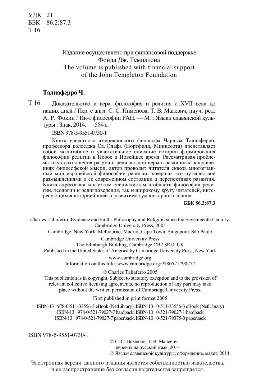 Книга известного американского философа Чарльза Талиаферро, профессора колледжа Св. Олафа (Нортфилд, Миннесота) представляет собой масштабное и увлекательное описание истории формирования философии религии в Новое и Новейшее время. Рассматривая проблематику соотношения разума и религиозной веры в различных направлениях философской мысли, автор проводит читателя сквозь многогранный мир европейской философии религии, завершая это путешествие размышлениями о ее современном состоянии и перспективах развития. Книга адресована как узким специалистам в области философии религии, теологии и религиоведения, так и широкому кругу читателей, интересующихся историей идей и развитием гуманитарного знания.