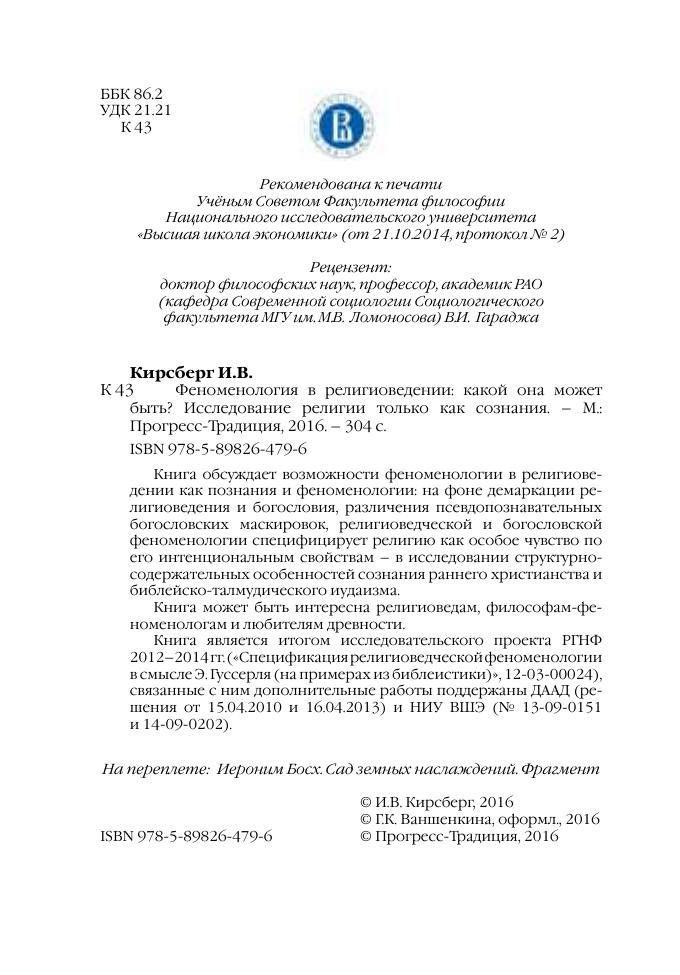 феноменологии специфицирует религию как особое чувство по его интенциональным свойствам – в исследовании структурно-содержательных особенностей сознания раннего христианства и библейско-талмудического иудаизма. Книга может быть интересна религиоведам, философам-феноменологам и любителям древности. Книга является итогом исследовательского проекта РГНФ 2012–2014 гг. («Спецификация религиоведческой феноменологии в смысле Э. Гуссерля (на примерах из библеистики)», 12-03-00024), связанные с ним дополнительные работы поддержаны ДААД (решения от 15.04.2010 и 16.04.2013) и НИУ ВШЭ (№ 13-09-0151 и 14-09-0202).