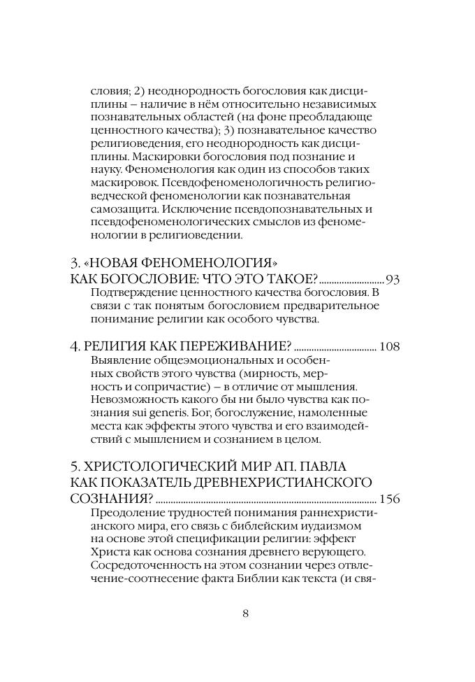 Книга обсуждает возможности феноменологии в религиоведении как познания и феноменологии: на фоне демаркации религиоведения и богословия, различения псевдопознавательных богословских маскировок, религиоведческой и богословской