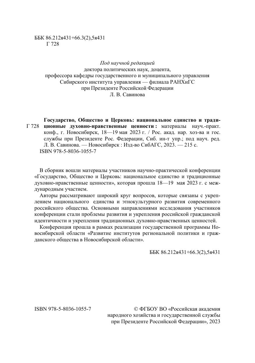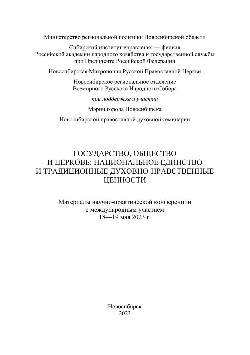 Государство, Общество и Церковь: национальное единство и традиционные духовно-нравственные ценности: материалы науч.-практ. конф., г. Новосибирск, 18—19 мая 2023 г.
