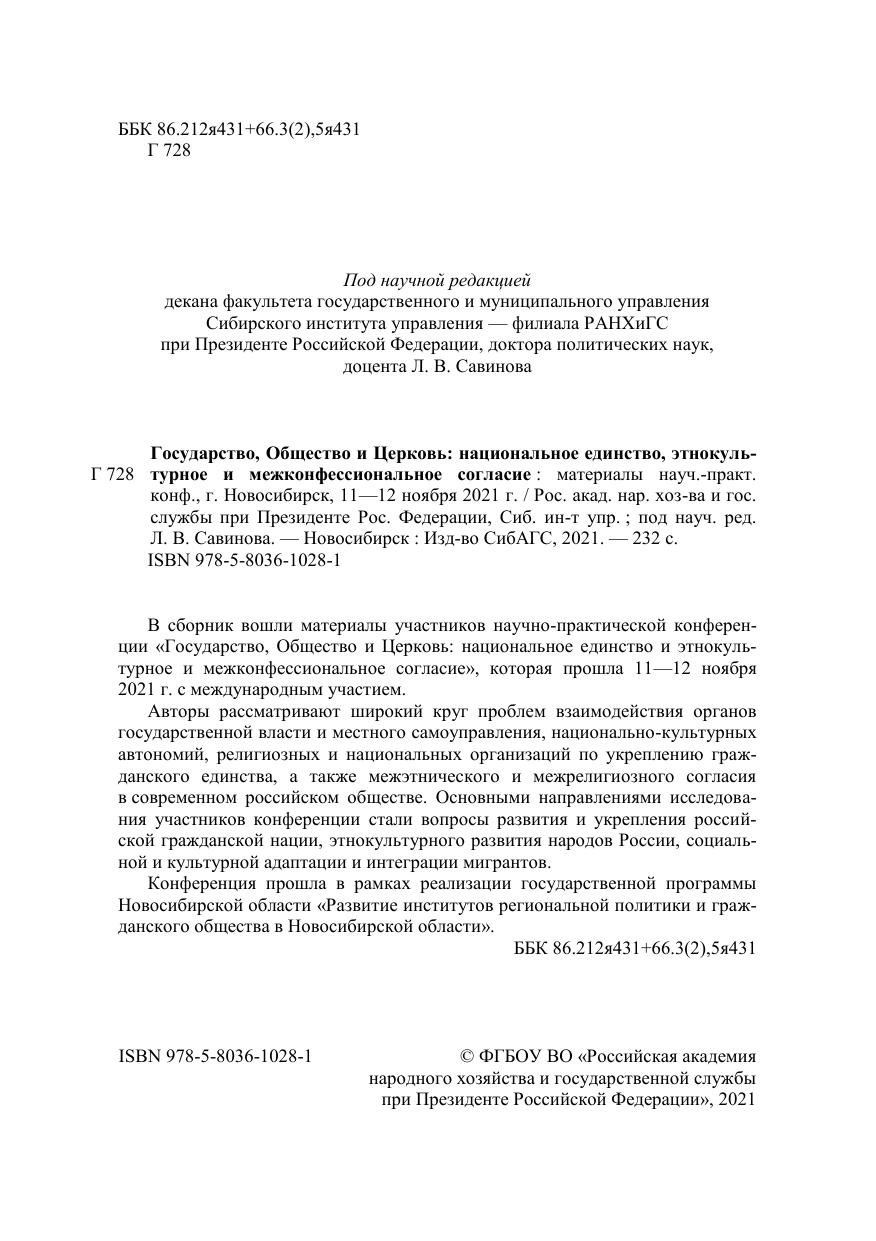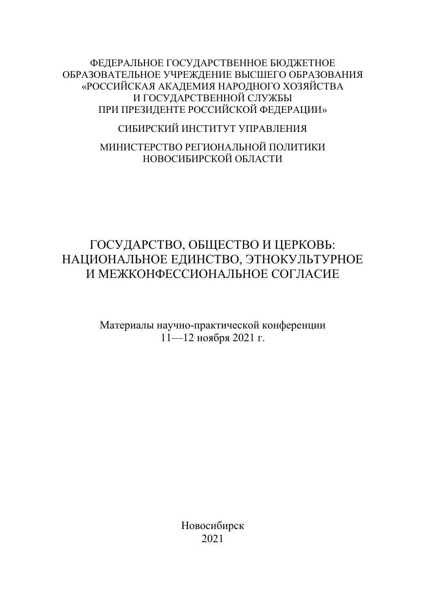 Государство, Общество и Церковь: национальное единство, этнокультурное и межконфессиональное согласие: материалы науч.-практ. конф., г. Новосибирск, 11—12 ноября 2021 г.