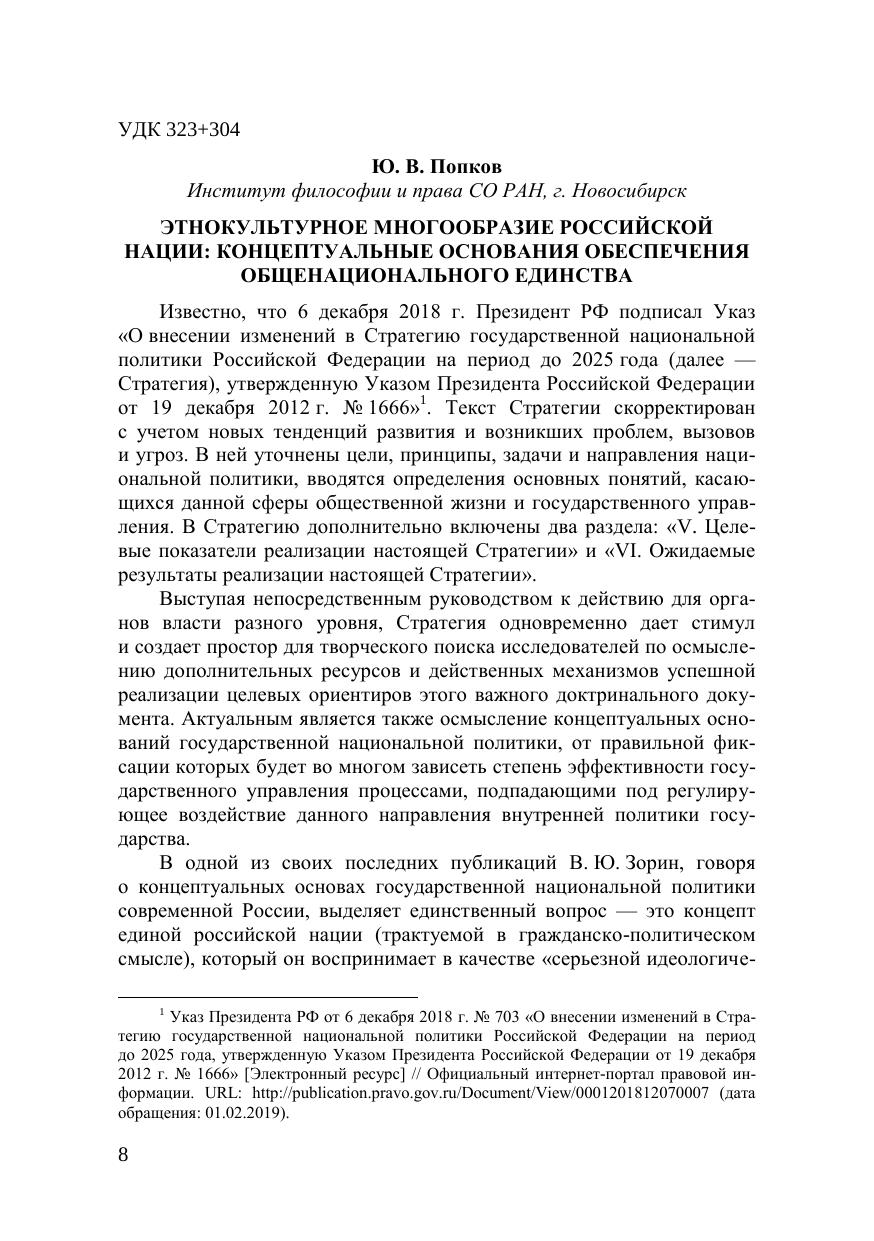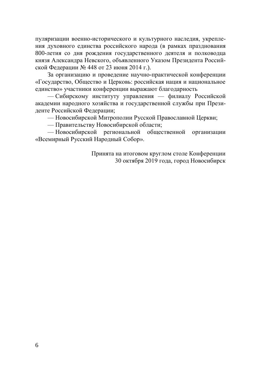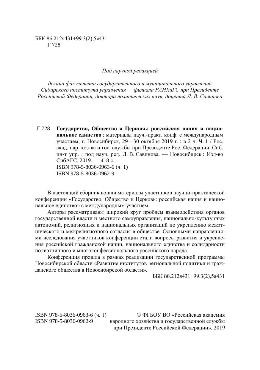 Государство, Общество и Церковь: российская нация и национальное единство: материалы науч.-практ. конф. с международным участием, г. Новосибирск, 29—30 октября 2019 г. : в 2 ч. Ч. 1
