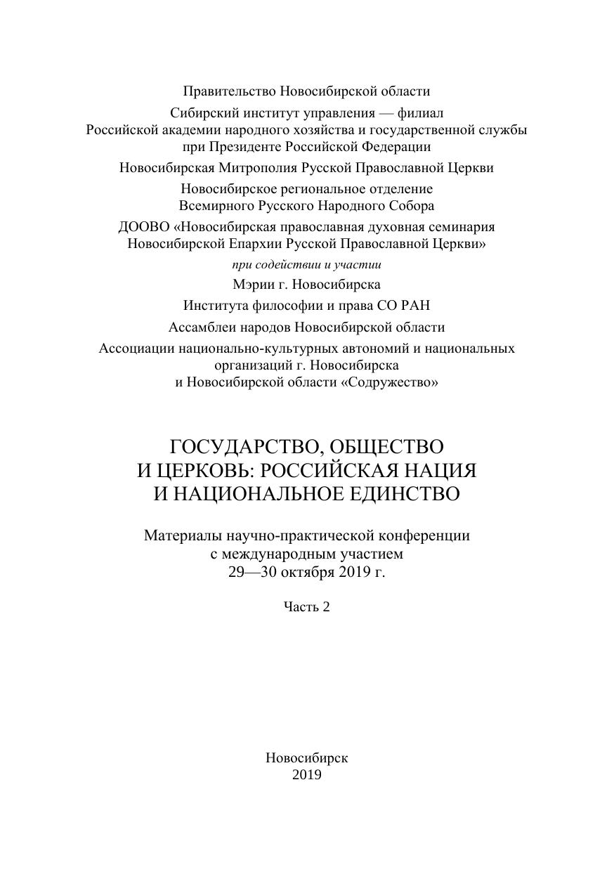Государство, Общество и Церковь: российская нация и национальное единство: материалы науч.-практ. конф. с международным участием, г. Новосибирск, 29—30 октября 2019 г.: в 2 ч. Ч. 2
