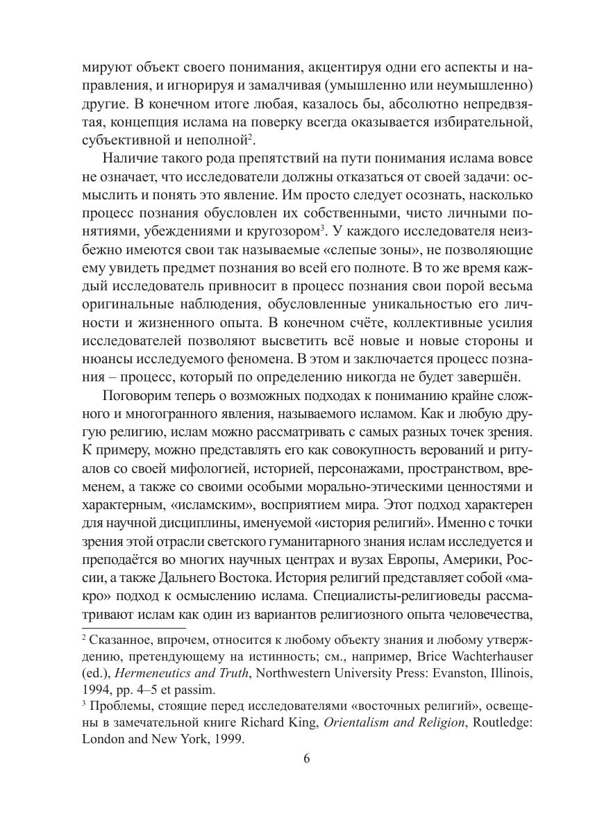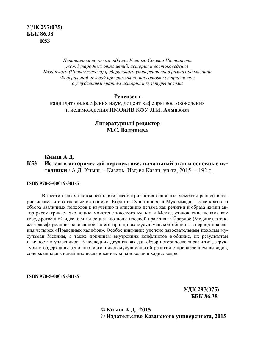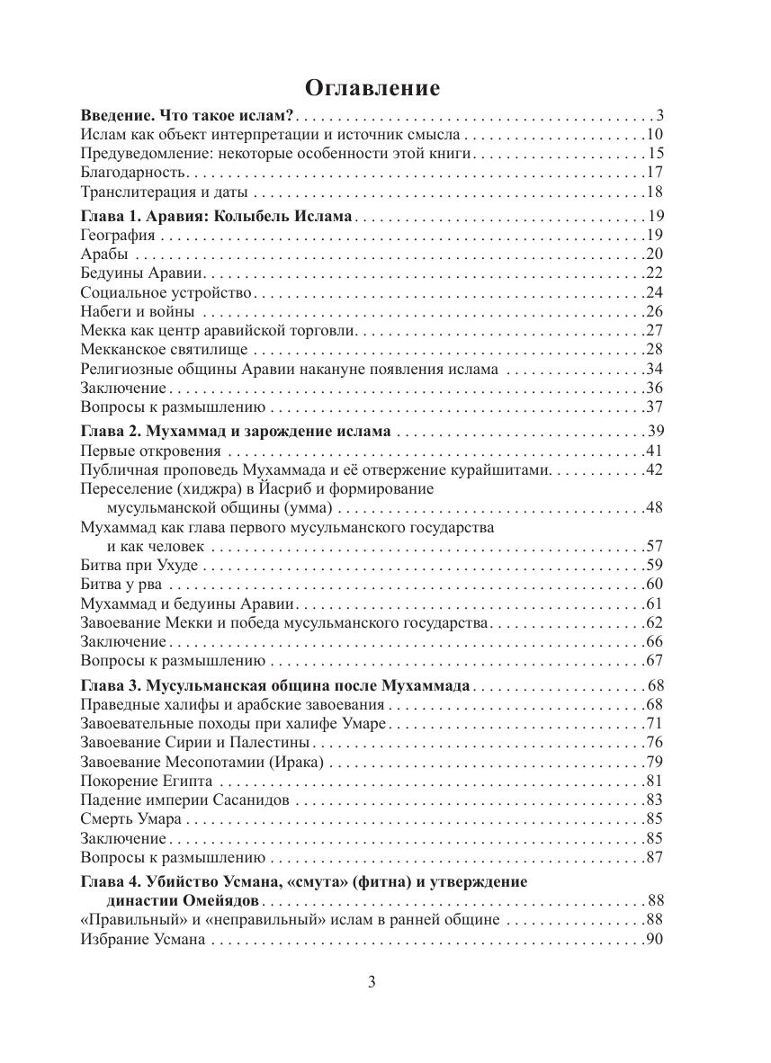 В шести главах настоящей книги рассматриваются основные моменты ранней истории ислама и его главные источники: Коран и Сунна пророка Мухаммада. После краткого обзора различных подходов к изучению и описанию ислама как религии и образа жизни автор рассматривает эволюцию монотеистического культа в Мекке, становление ислама как государственной идеологии и социально-политической практики в Йасрибе (Медине), а также трансформацию основанной на его принципах мусульманской общины в период правления четырех «Праведных халифов». Особое внимание уделено завоевательным походам мусульман Медины, а также причинам внутренних конфликтов в общине, их результатам и личностям участников. В последних двух главах дан обзор исторического развития, структуры и содержания основных источников мусульманской религии с привлечением выводов, содержащихся в новейших исследованиях корановедов и хадисоведов.