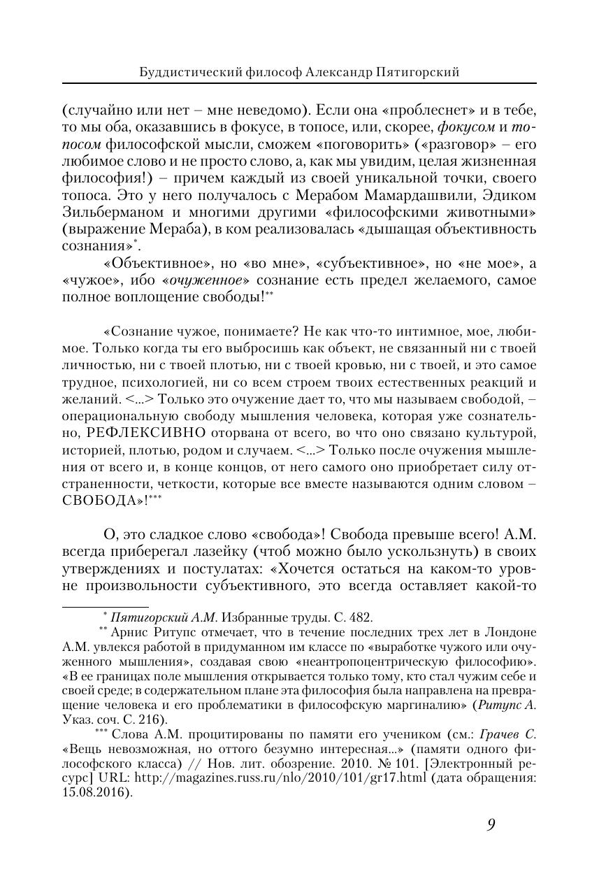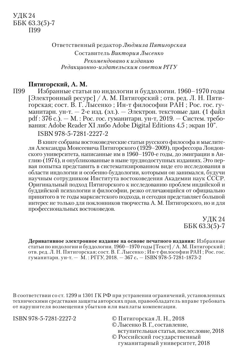 В книге собраны востоковедческие статьи русского философа и мыслителя Александра Моисеевича Пятигорского (1929–2009), профессора Лондонского университета, написанные им в 1960–1970-е годы, до эмиграции в Англию (1974), и опубликованные в ныне труднодоступных изданиях. Это первая попытка представить в систематизированном виде его исследования в области индологии и особенно буддологии, которыми он занимался, будучи научным сотрудником Института востоковедения Академии наук CССР. Оригинальный подход Пятигорского к исследованию проблем индийской и буддийской психологии и философии, резко отличающийся от официально принятого в те годы марксистского подхода, и сегодня представляет большой интерес не только для поклонников творчества А. М. Пятигорского, но и для профессиональных востоковедов.