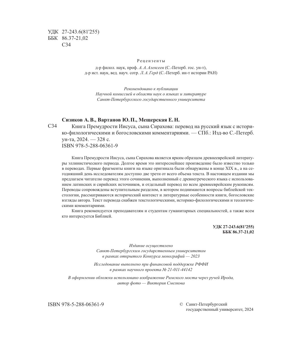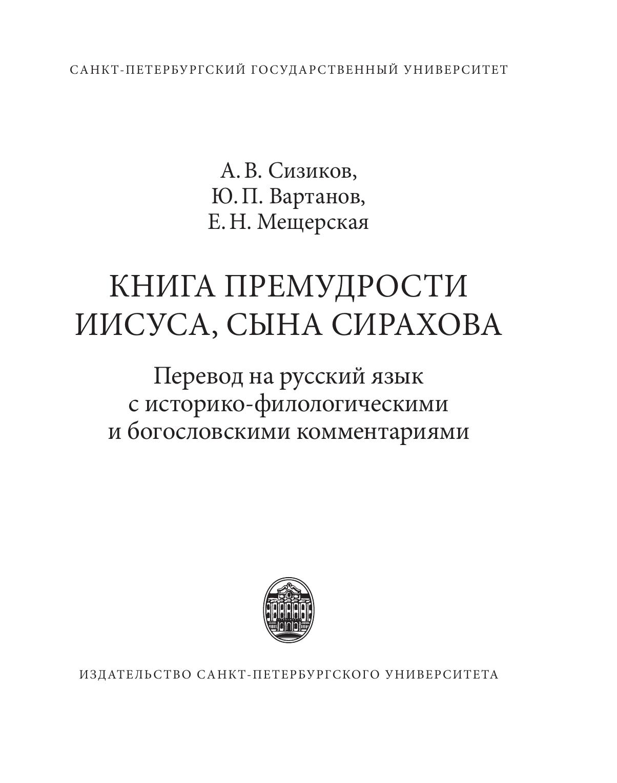 Книга Премудрости Иисуса, сына Сирахова: перевод на русский язык с историко-филологическими и богословскими комментариями