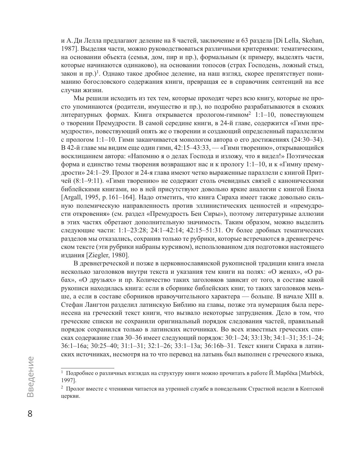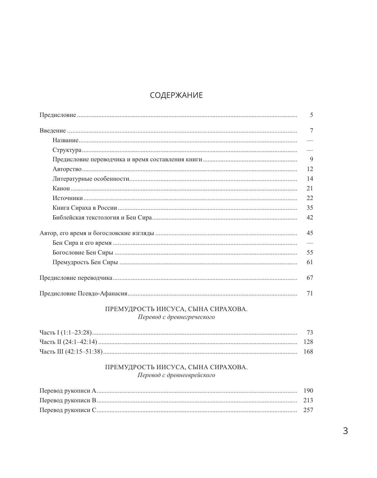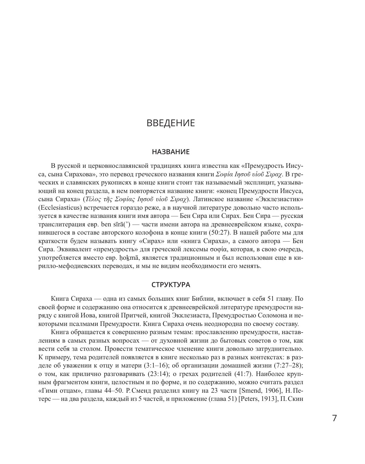 Книга Премудрости Иисуса, сына Сирахова является ярким образцом древнееврейской литературы эллинистического периода. Долгое время это интерейснейшее произведение было известно только в переводах. Первые фрагменты книги на языке оиргинала были обнаружены в конце XIX в., а на сегодняшний день исследователям доступно две трети от всего объема текста, В настоящем издании мы предлагаем читателю перевод этого сочинения, выполненный с древнегреческого языка с использованием латинских и сирийских источников, и отдельный перевод по всем древнееврейским рукописям. Перерводы сопровождаются вступительным разделом, в котором поднимаются вопросы библейской текстологии, рассматриваются исторический контекст и литературные особенности книги, богословские взгляды авторов. Текст перевода снабжен текстологическими, историко-филологическими и теологическими комментариями. Книга рекомендуется преподавателям и студентам гуманитарных специальностей, а также всем кто интересуется Библией.