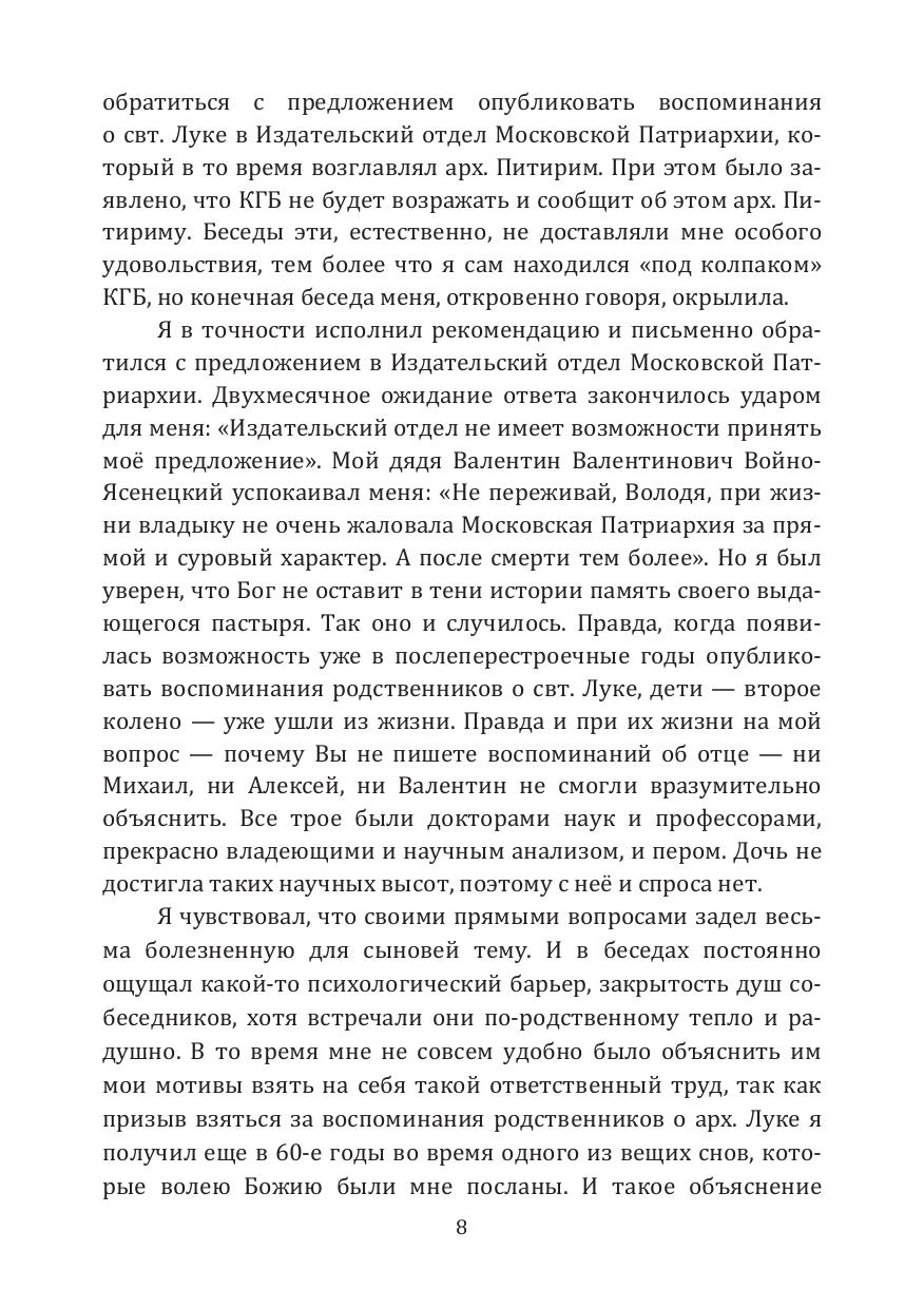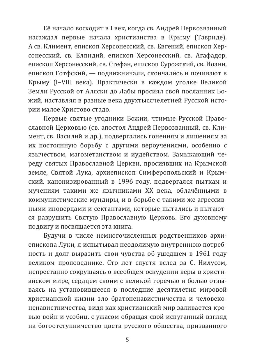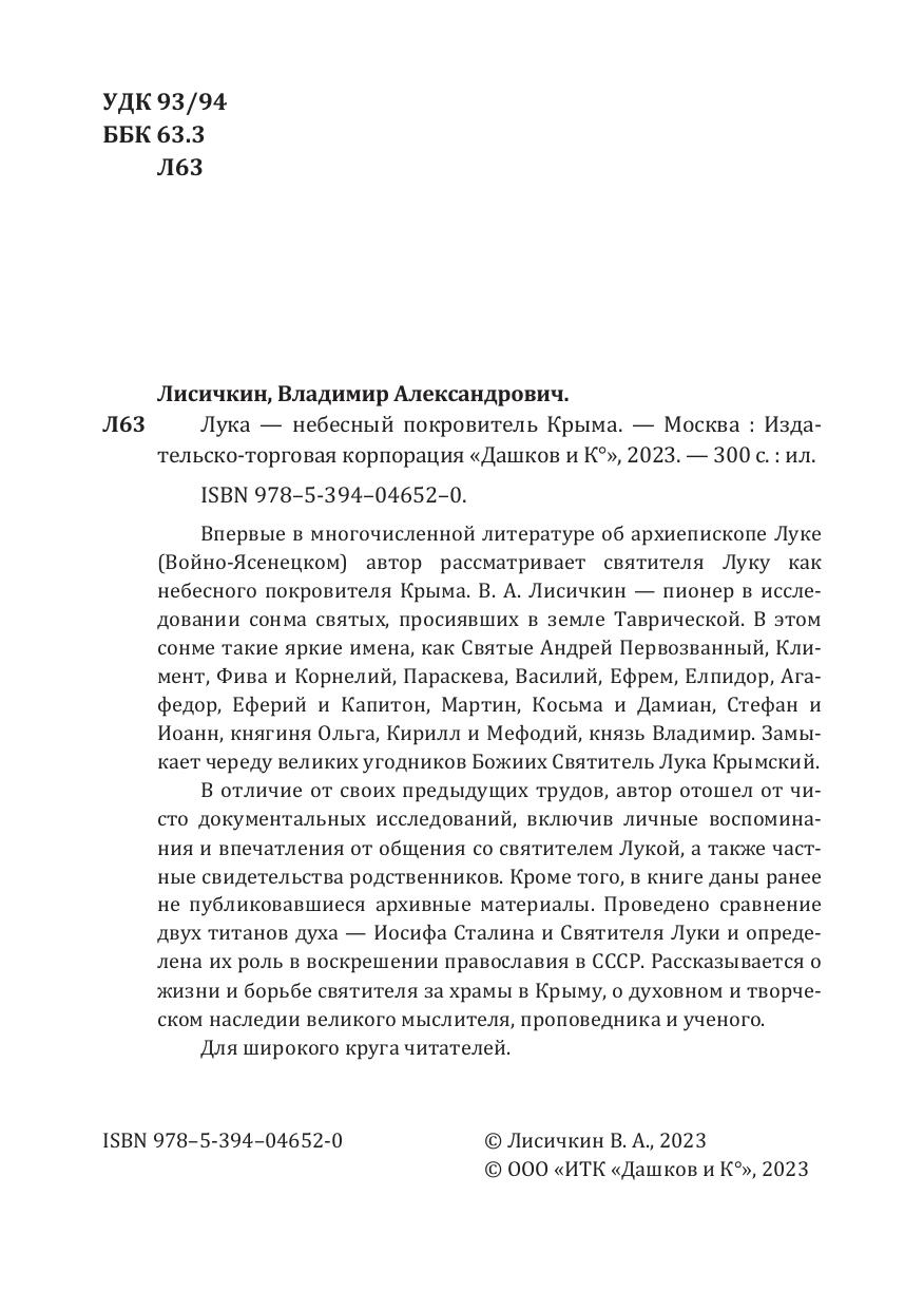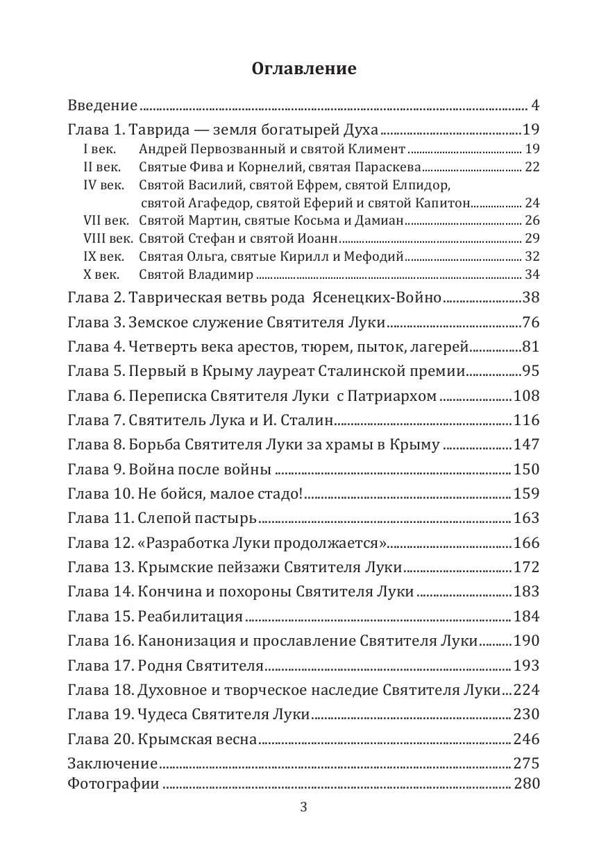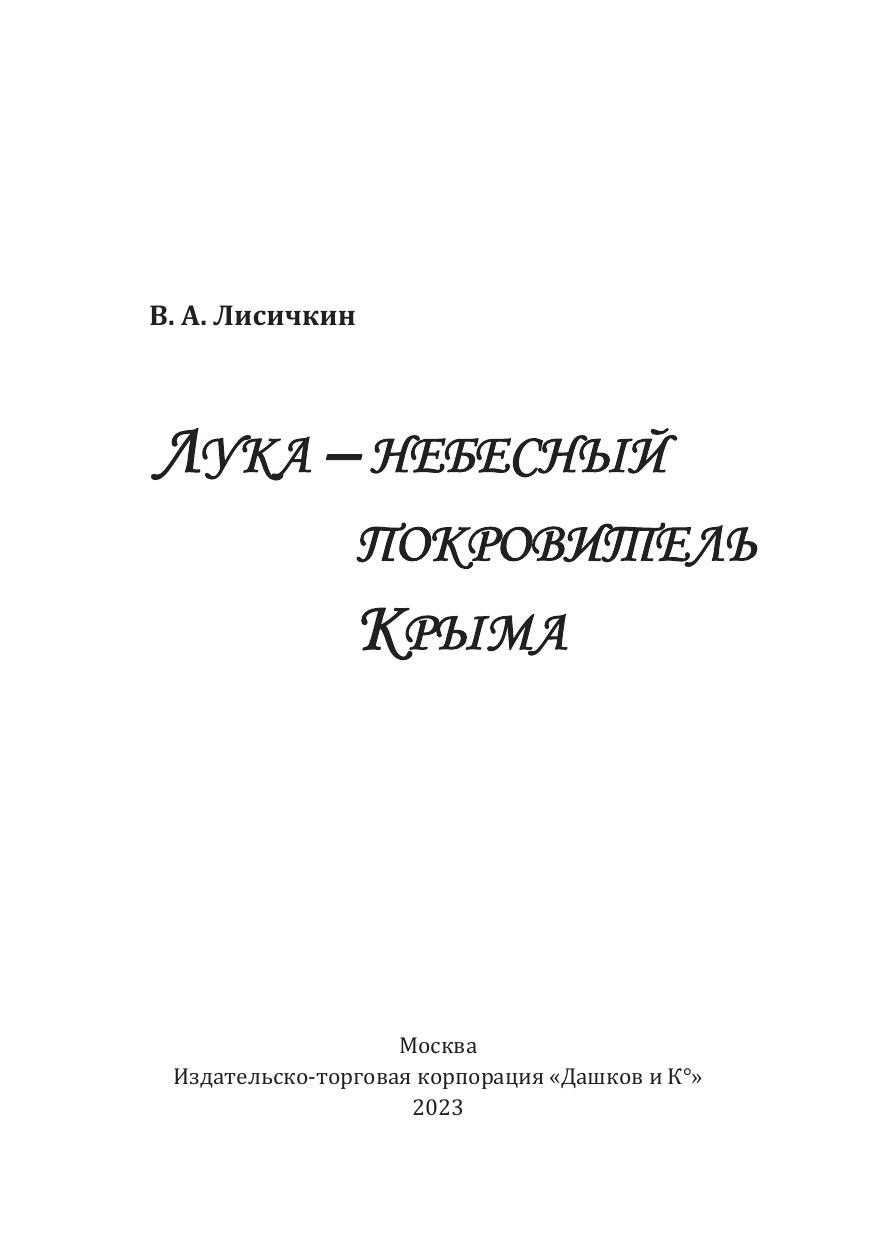 Впервые в многочисленной литературе об архиепископе Луке (Войно-Ясенецком) автор рассматривает святителя Луку как небесного покровителя Крыма. В. А. Лисичкин — пионер в исследовании сонма святых, просиявших в земле Таврической. В этом сонме такие яркие имена, как Святые Андрей Первозванный, Климент, Фива и Корнелий, Параскева, Василий, Ефрем, Елпидор, Агафедор, Еферий и Капитон, Мартин, Косьма и Дамиан, Стефан и Иоанн, княгиня Ольга, Кирилл и Мефодий, князь Владимир. Замыкает череду великих угодников Божиих Святитель Лука Крымский. В отличие от своих предыдущих трудов, автор отошел от чисто документальных исследований, включив личные воспоминания и впечатления от общения со святителем Лукой, а также частные свидетельства родственников. Кроме того, в книге даны ранее непубликовавшиеся архивные материалы. Проведено сравнение двух титанов духа — Иосифа Сталина и Святителя Луки и определена их роль в воскрешении православия в СССР. Рассказывается о жизни и борьбе святителя за храмы в Крыму, о духовном и творческом наследии великого мыслителя, проповедника и ученого.