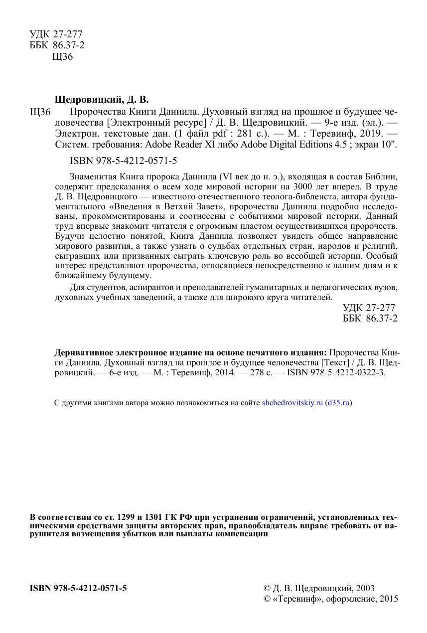 Знаменитая Книга пророка Даниила (VI век до н. э.), входящая в состав Библии, содержит предсказания о всем ходе мировой истории на 3000 лет вперед. В труде Д.В. Щедровицкого — известного отечественного теолога-библеиста, автора фундаментального «Введения в Ветхий Завет», пророчества Даниила подробно исследованы, прокомментированы и соотнесены с событиями мировой истории. Данный труд впервые знакомит читателя с огромным пластом осуществившихся пророчеств. Будучи целостно понятой, Книга Даниила позволяет увидеть общее направление мирового развития, а также узнать о судьбах отдельных стран, народов и религий, сыгравших или призванных сыграть ключевую роль во всеобщей истории. Особый интерес представляют пророчества, относящиеся непосредственно к нашим дням и к ближайшему будущему.