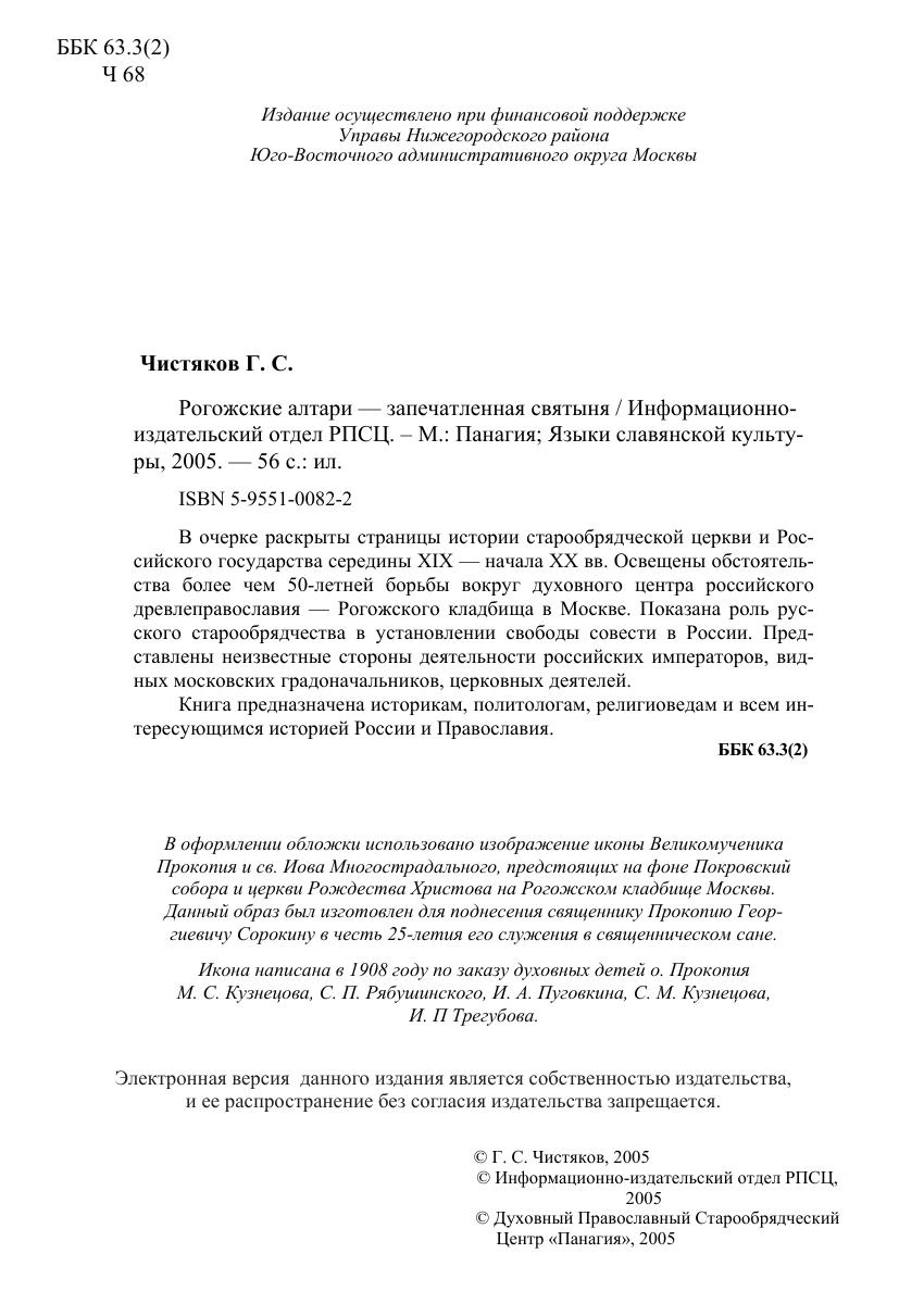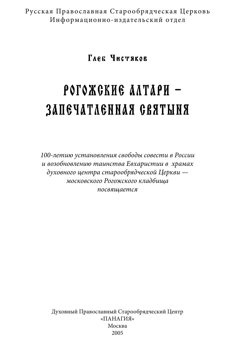В очерке раскрыты страницы истории старообрядческой церкви и Российского государства середины XIX — начала XX вв. Освещены обстоятельства более чем 50-летней борьбы вокруг духовного центра российского древлеправославия — Рогожского кладбища в Москве. Показана роль русского старообрядчества в установлении свободы совести в России. Представлены неизвестные стороны деятельности российских императоров, видных московских градоначальников, церковных деятелей. Книга предназначена историкам, политологам, религиоведам и всем интересующимся историей России и Православия.