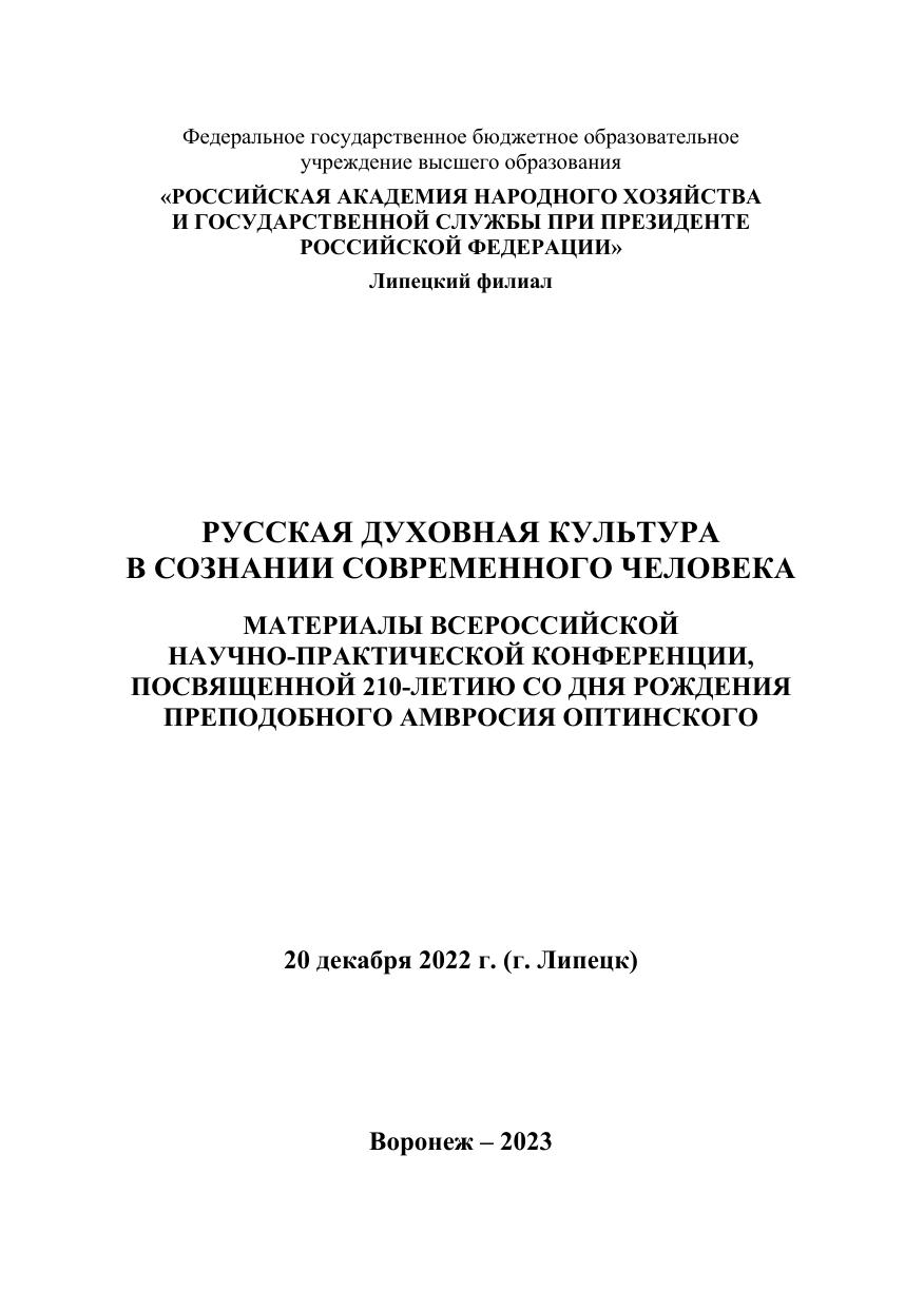 Русская духовная культура в сознании современного человека: материалы Всероссийской научно-практической конференции, посвященной 210-летию со дня рождения преподобного Амвросия Оптинского. 20 декабря 2022 г. (г. Липецк)